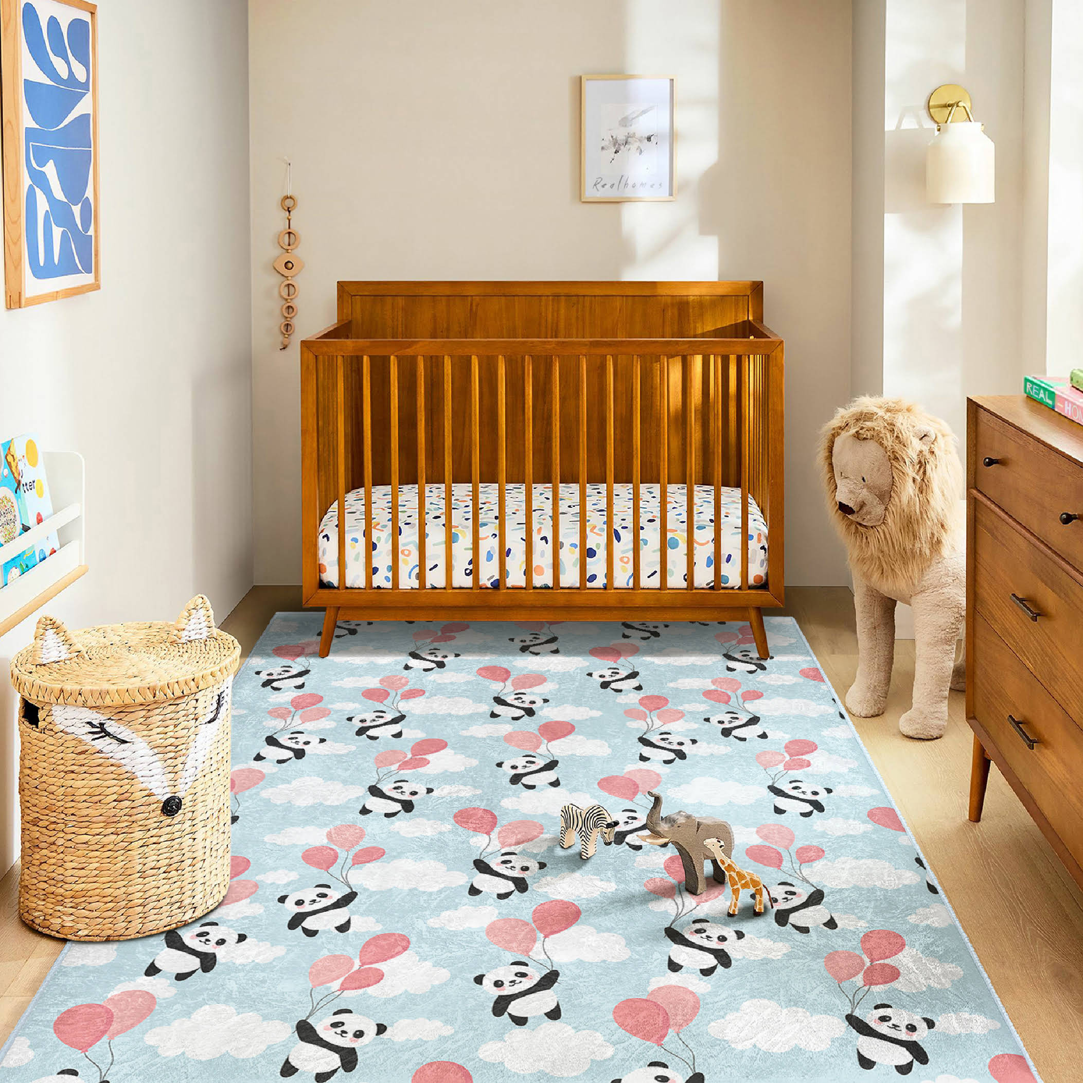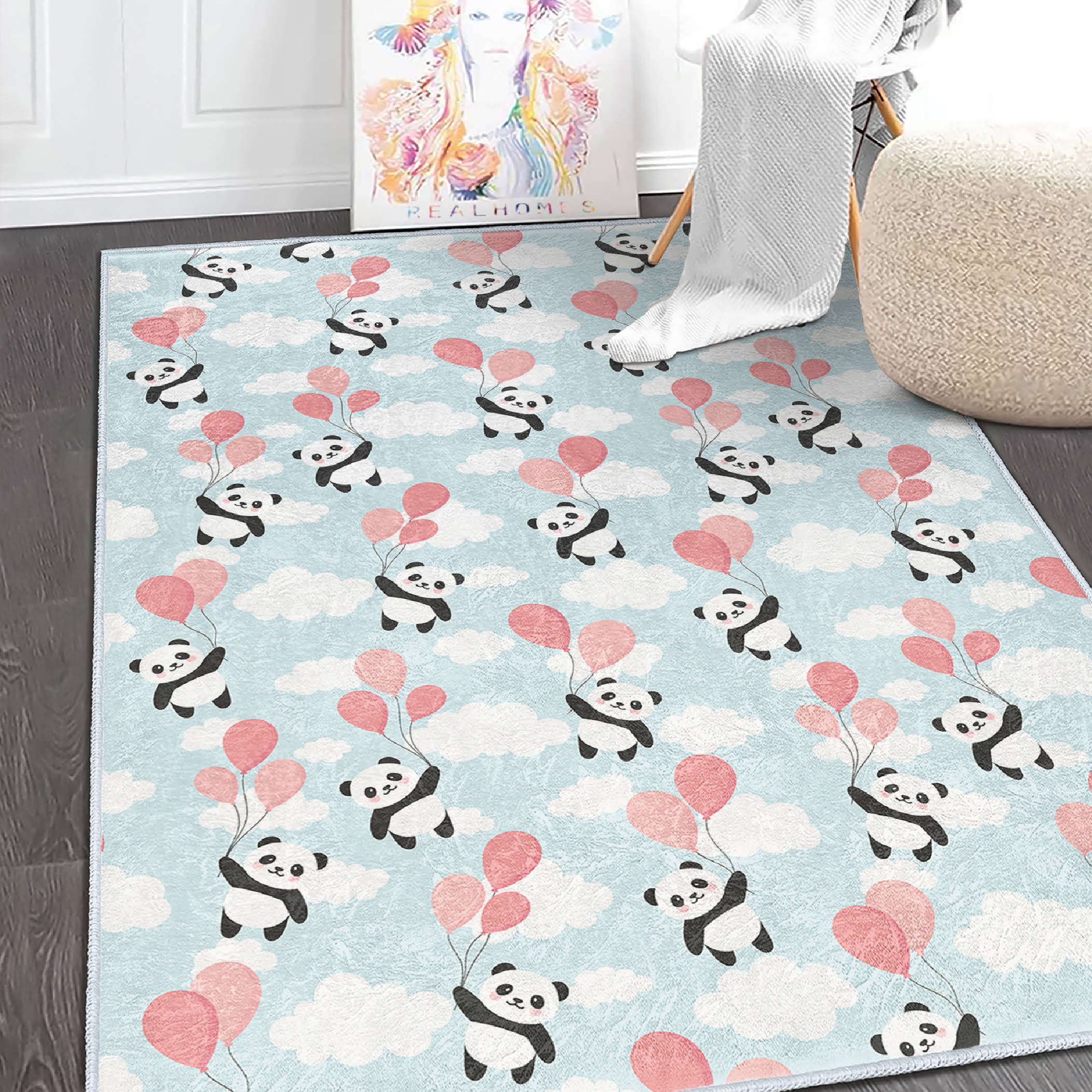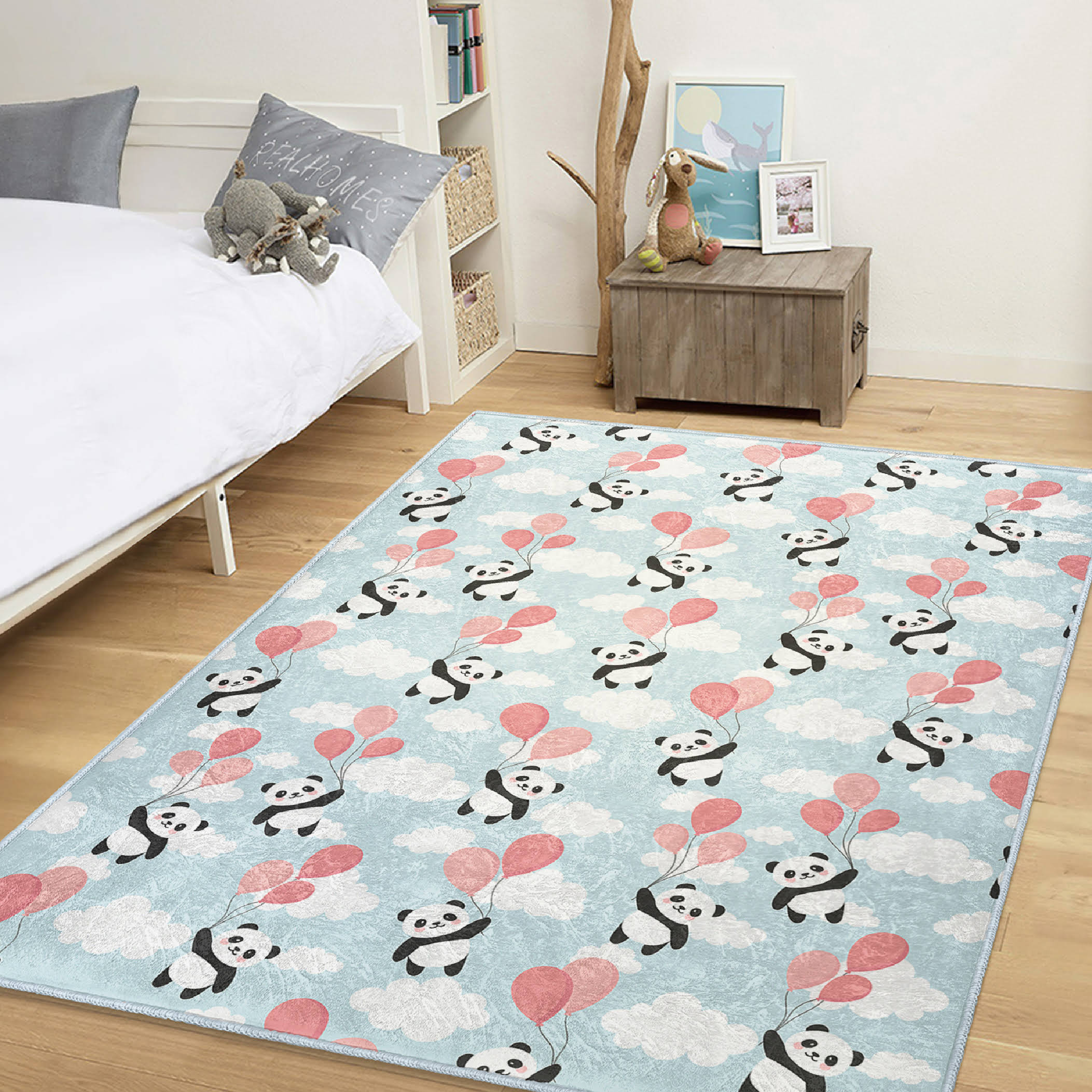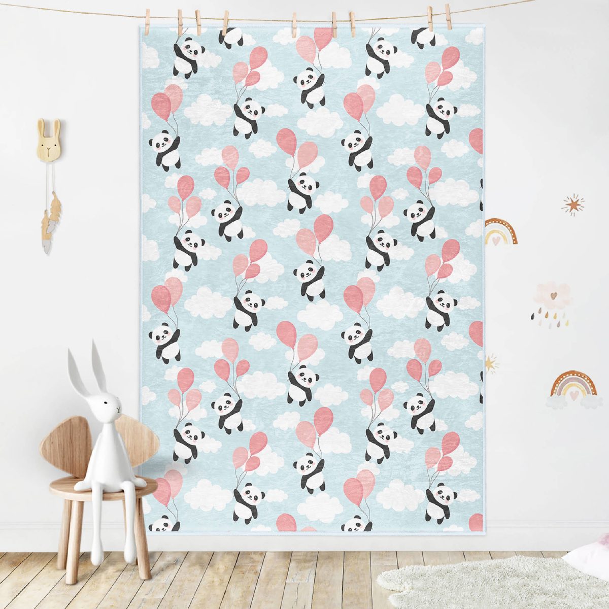 Balonlu Panda Tasarımlı Çocuk & Genç Odası Makinede Yıkanabilir Kaymaz Tabanlı Özel Ölçü Dekoratif Dikdörtgen Çocuk Halısı