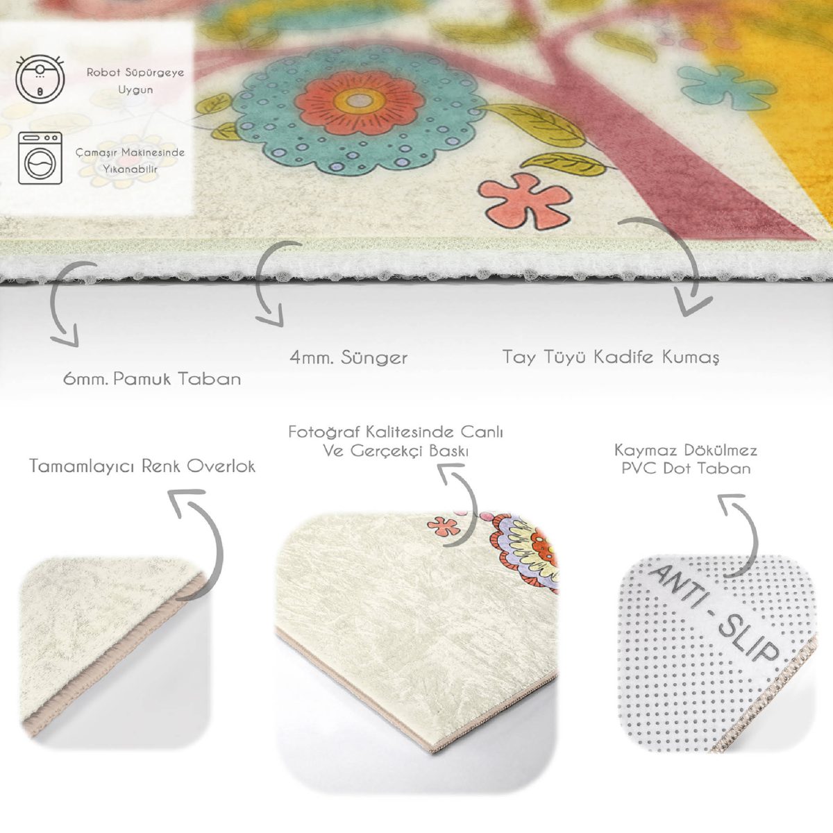 Baykuş Desenli Çocuk & Genç Odası Makinede Yıkanabilir Kaymaz Tabanlı Pamuk Tabanlı Özel Ölçü Leke Tutmaz Dikdörtgen Çocuk Odası Halısı