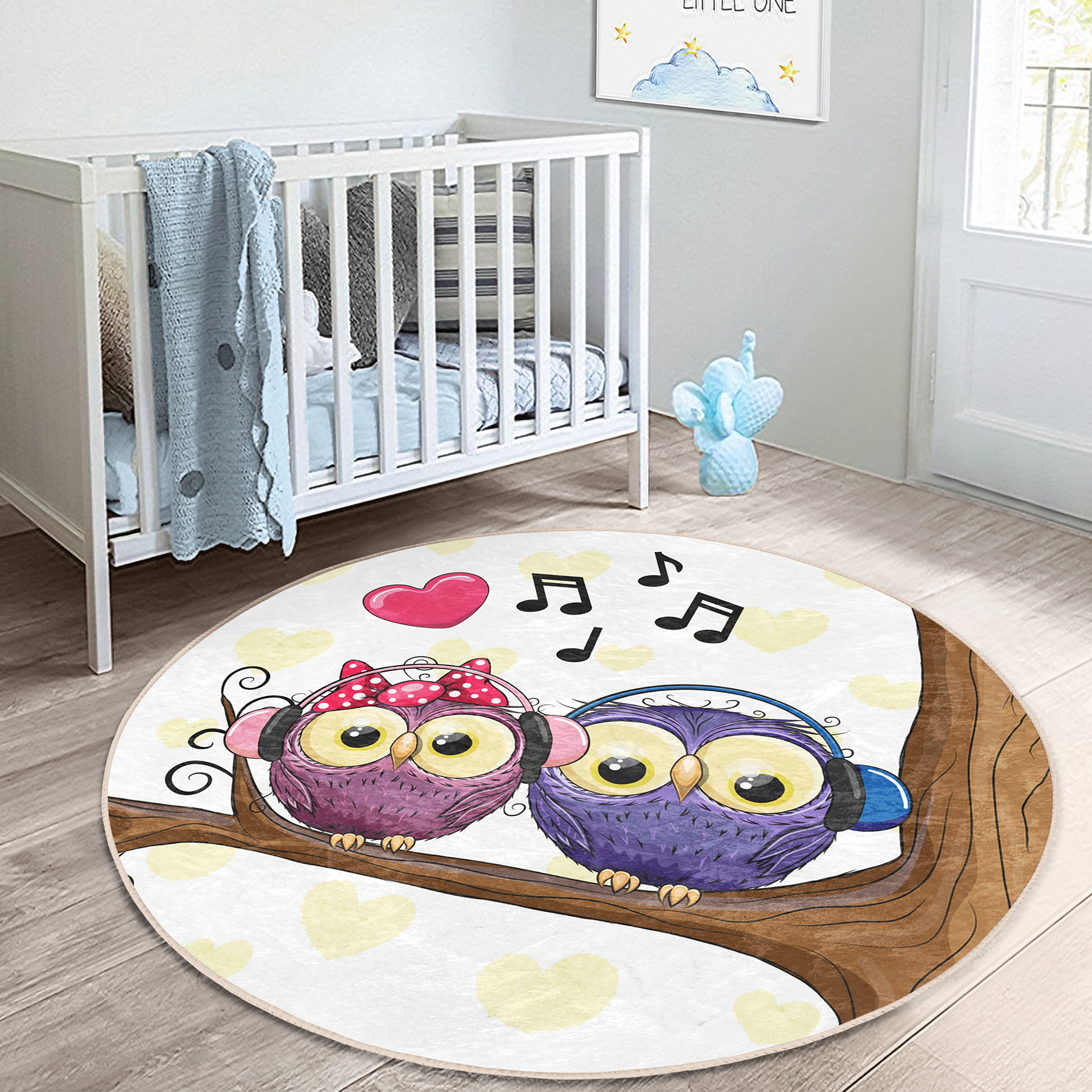 Baykuş Desenli Çocuk & Genç Odası Makinede Yıkanabilir Kaymaz Tabanlı Yuvarlak Çocuk Halısı