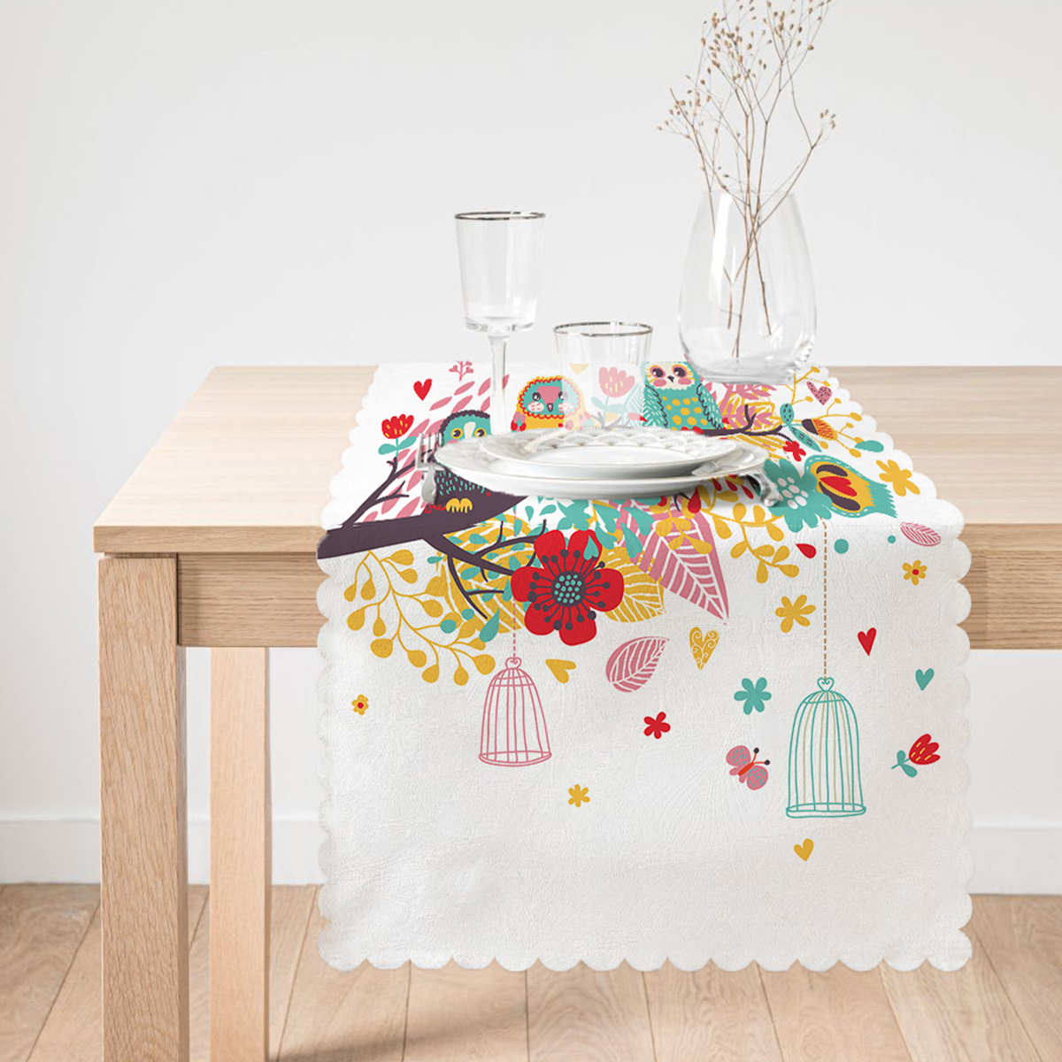 Baykuş Desenli Dijital Baskılı Dekoratif Runner