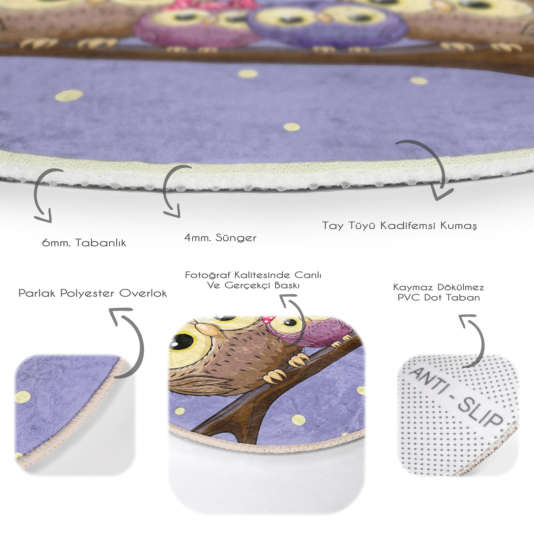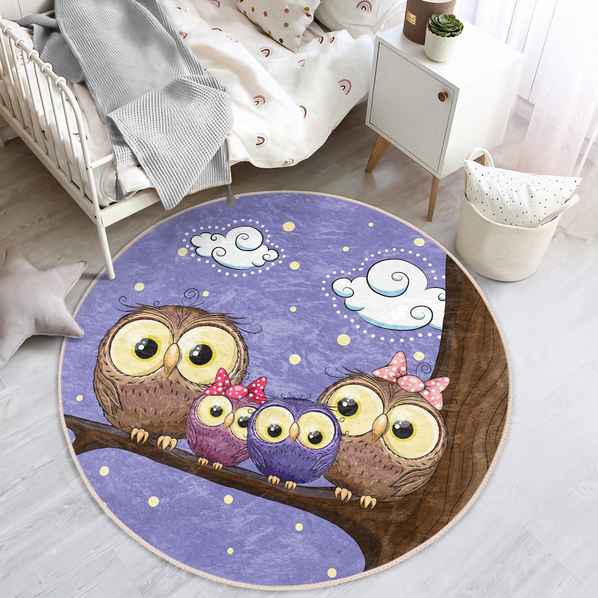 Baykuş Resimli Çocuk & Genç Odası Makinede Yıkanabilir Kaymaz Tabanlı Yuvarlak Çocuk Halısı