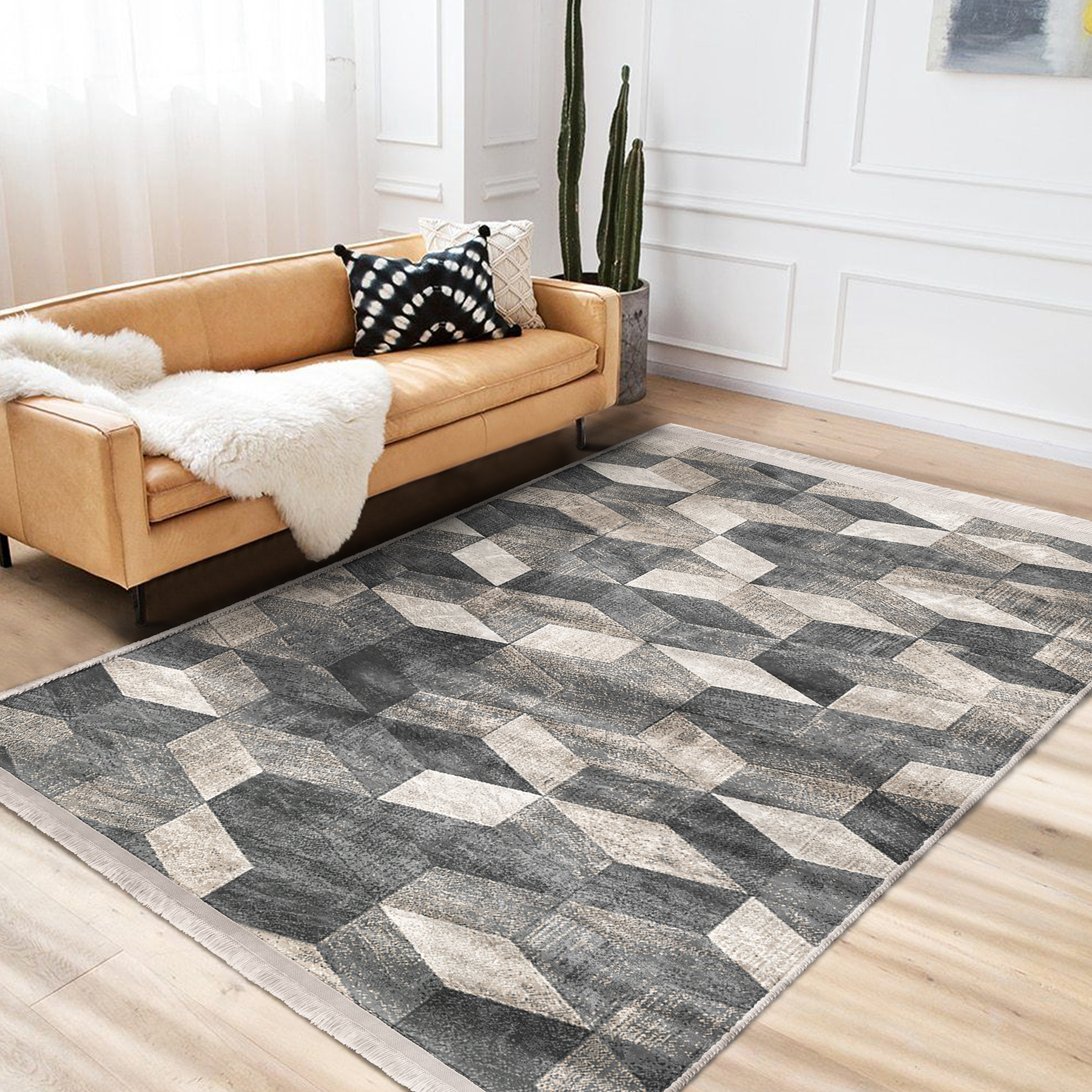 Bej – Gri Zeminde Örgü Motifli Geometrik Desenli Geometrik Eskitme Motifli Salon & Oturma Odası Koridor & Antre Dijital Baskılı Makinede Yıkanabilir Kaymaz Taban Saçaklı Halı