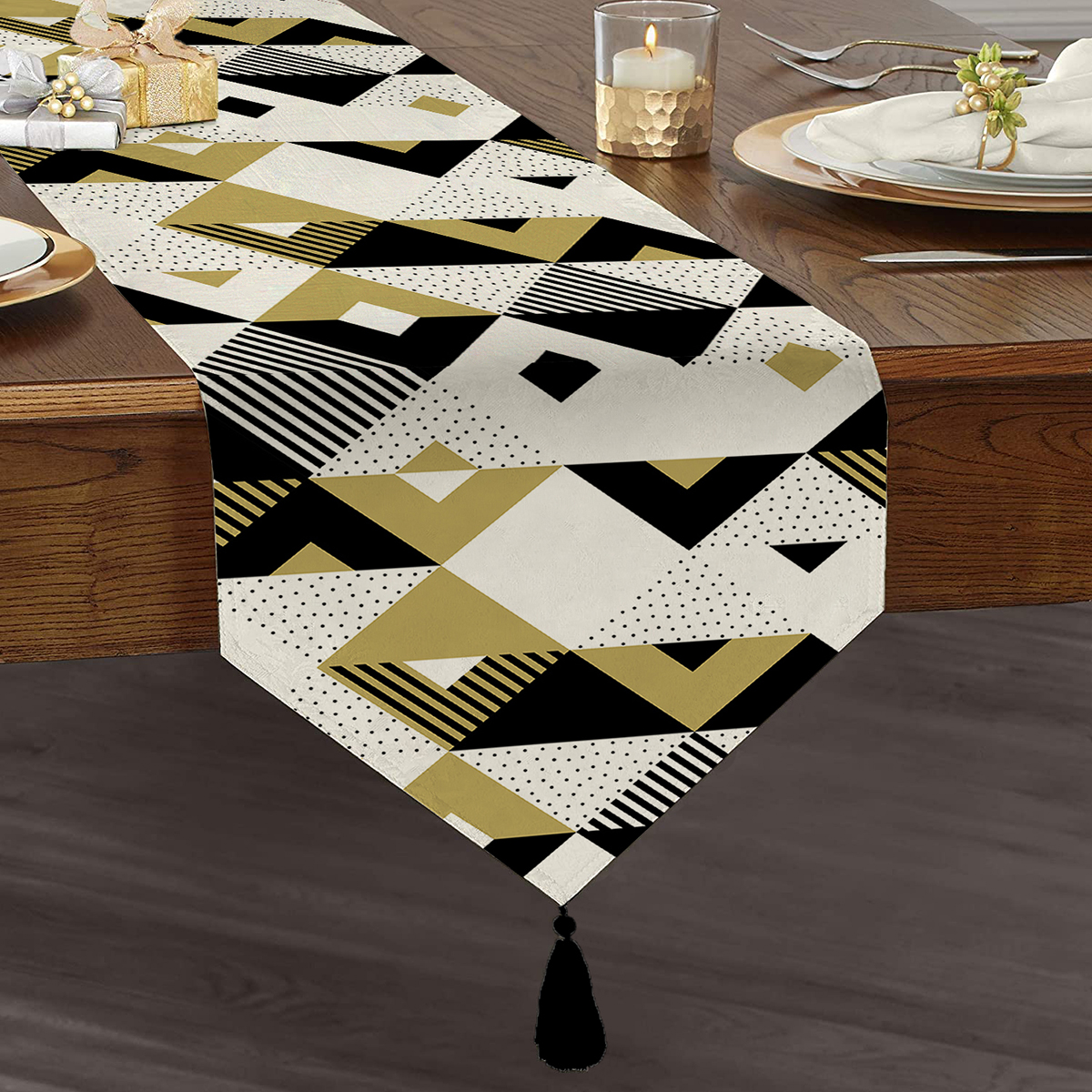 Bej Siyah Geometrik Desenli Dijital Baskılı Püsküllü Şönil Üçgen Runner Realhomes