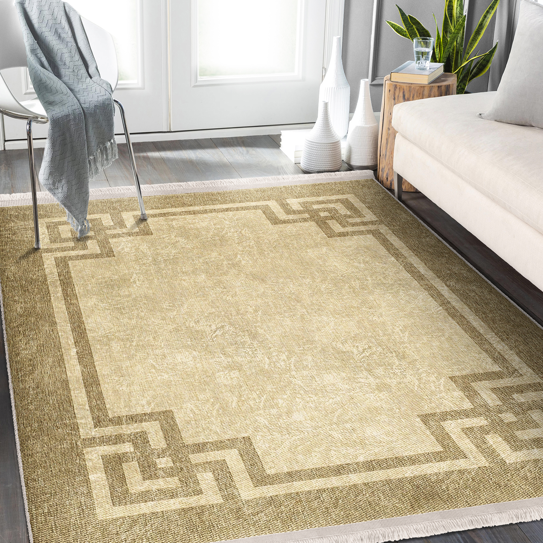 Bej Zeminde Çerçeveli Motifli Hasır Desenli Klasik Sade & Şık Salon & Oturma Odası Salon & Oturma Odası Dijital Baskılı Makinede Yıkanabilir Kaymaz Taban Saçaklı Halı