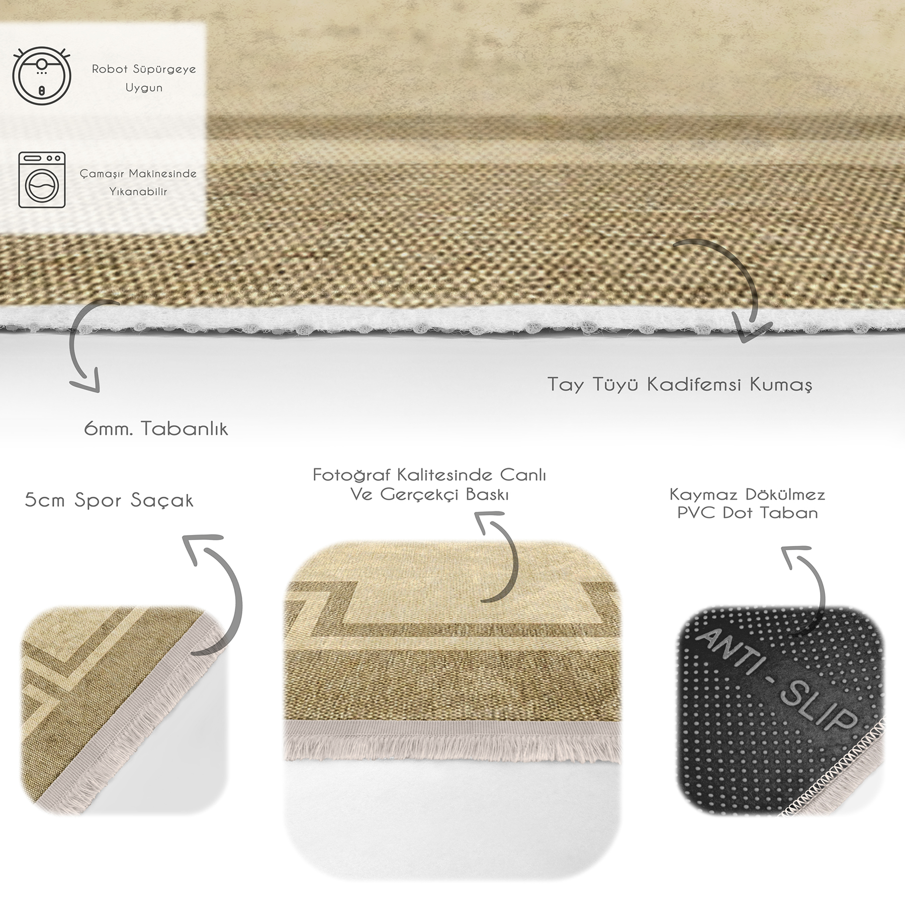 Tabanlık ve Dolgu: 5 mm Kaymaz dokuma tabanlıdır.