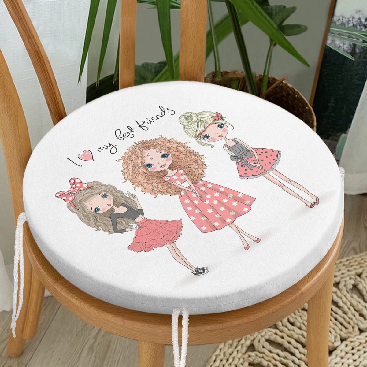 Best Friends Temalı Dijital Baskılı Modern Yuvarlak Fermuarlı Sandalye Minderi