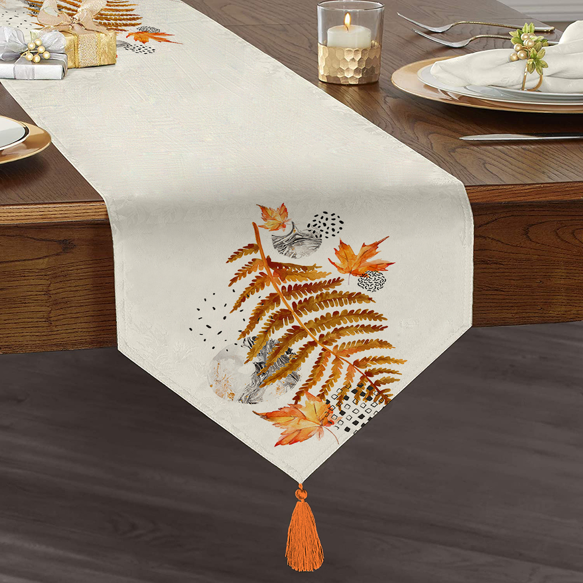 Beyaz Mermer Zemin Üzerinde Sonbahar Kurumuş Yaprak Desenli Püsküllü Şönil Üçgen Runner
