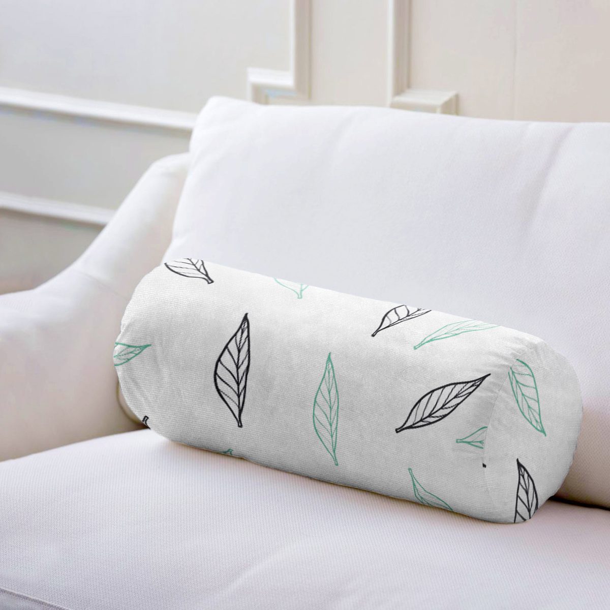 Beyaz Temalı Yaprak Desenli Dijital Baskılı Modern İç Dolgulu – Fermuarlı Süet Silindir Daire Yastık Kırlent