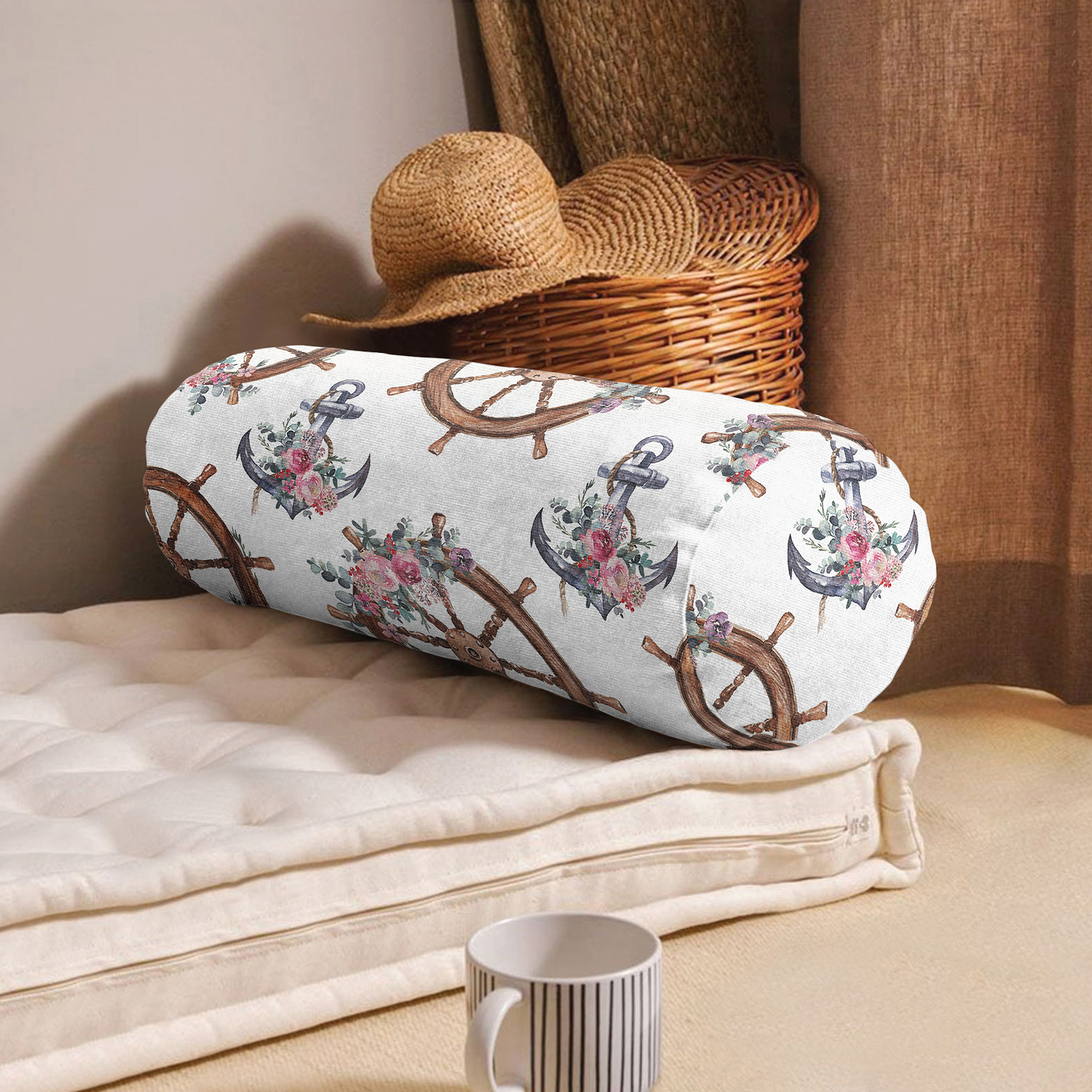 Beyaz Zemin Çapa & Dümen Tasarımlı Dijital Baskılı Dekoratif İç Dolgulu – Fermuarlı Süet Silindir Daire Yastık Kırlent