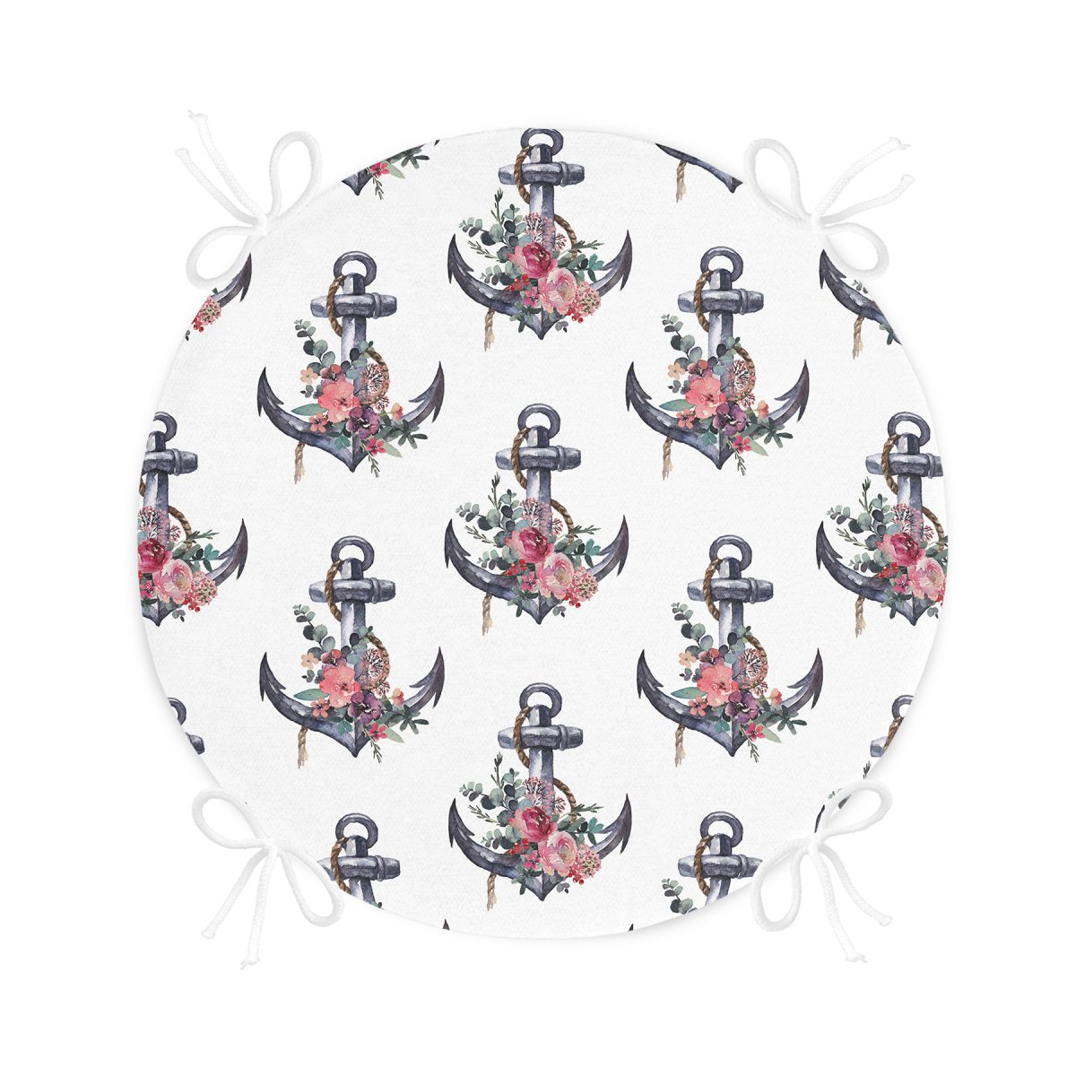 Beyaz Zemin Çapa Motifli Dijital Baskılı Modern Yuvarlak Fermuarlı Sandalye Minderi Realhomes