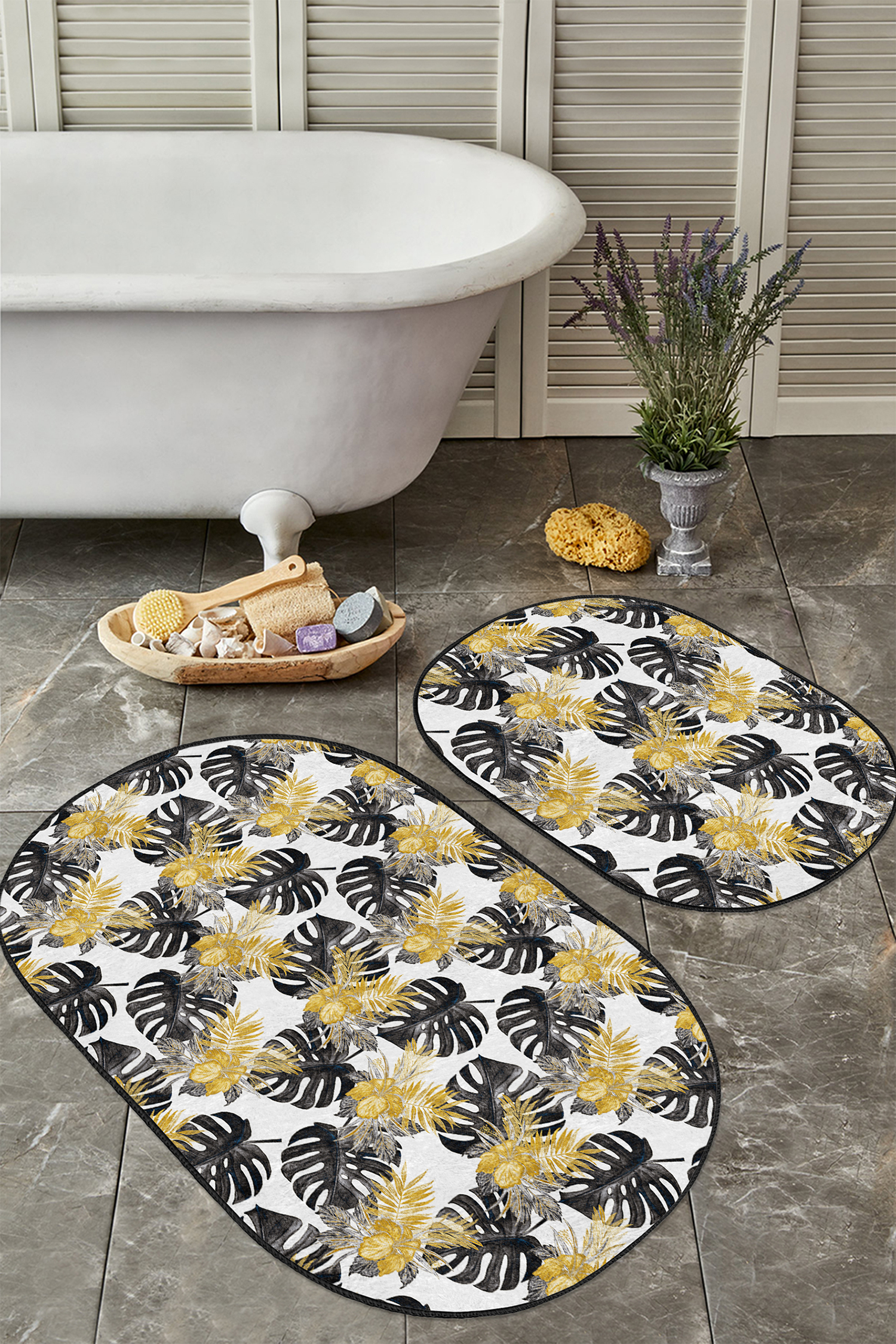 Beyaz Zemin Siyah Gold Detaylı Tropik Yapraklar 2’li Oval Kaymaz Tabanlı Banyo & Mutfak Paspas Takımı