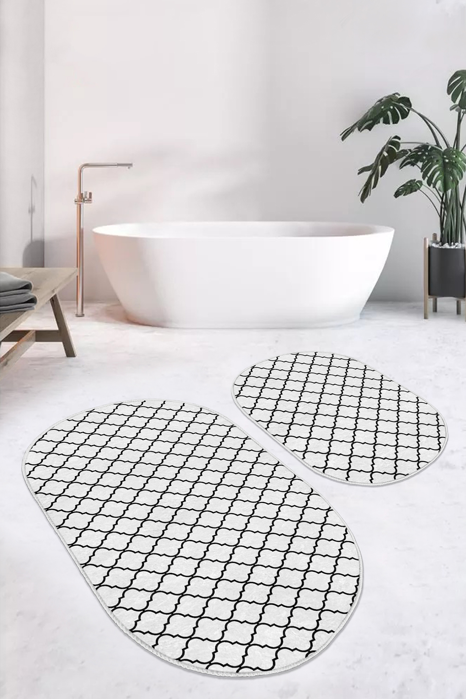 Beyaz Zemin Siyah Ogea Tasarımlı 2'li Oval Kaymaz Tabanlı Banyo & Mutfak Paspas Takımı Realhomes