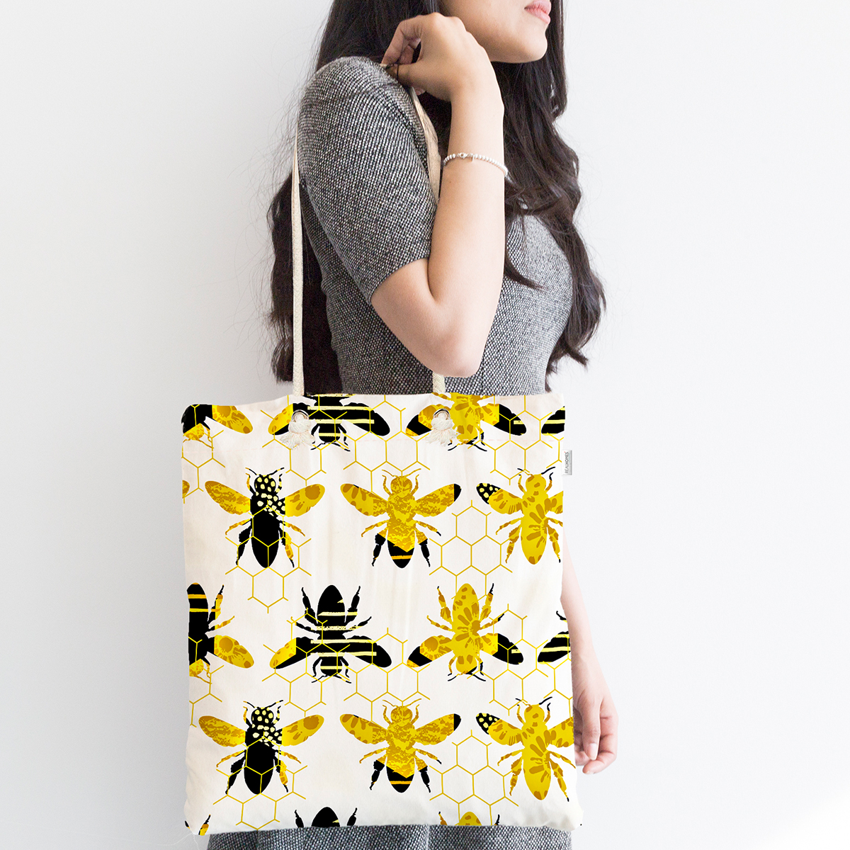 Beyaz Zemin Üzerinde Arı Motifli Dijital Baskılı Kumaş Plaj Çantası Realhomes