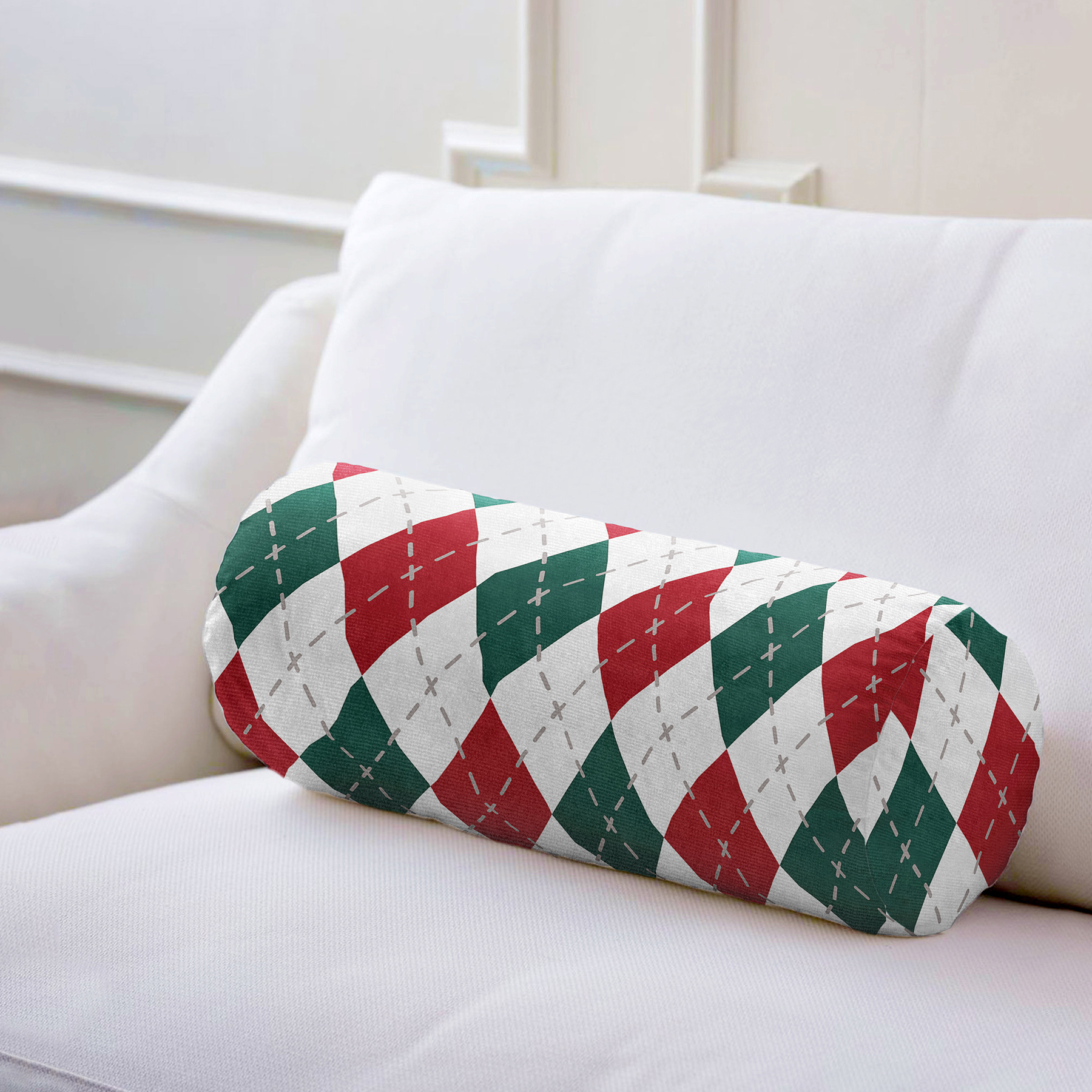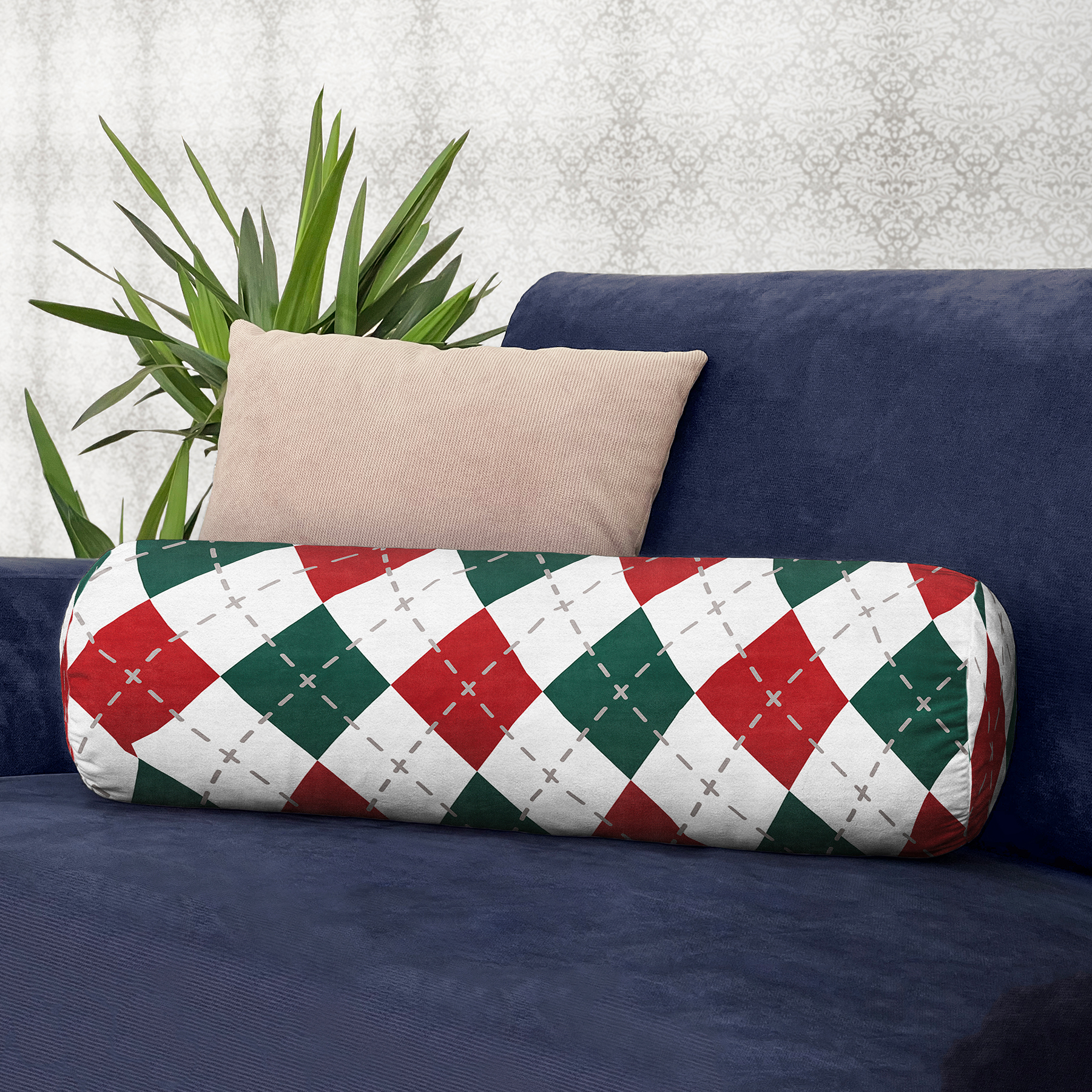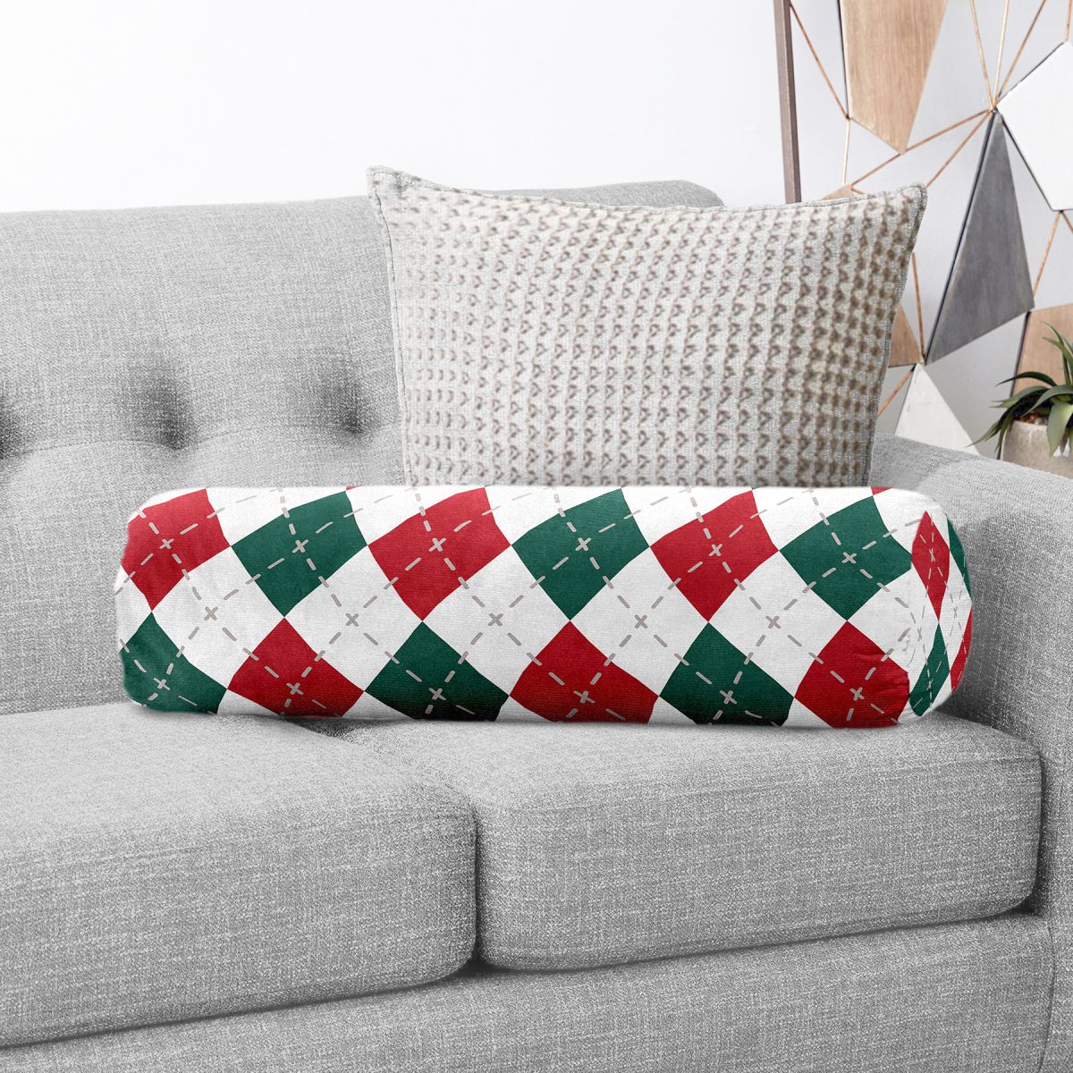 Beyaz Zemin Üzerinde Bordo Ve Yeşil Ekose Desenli Dijital Baskılı Modern İç Dolgulu – Fermuarlı Süet Silindir Yuvarlak Yastık Kırlent