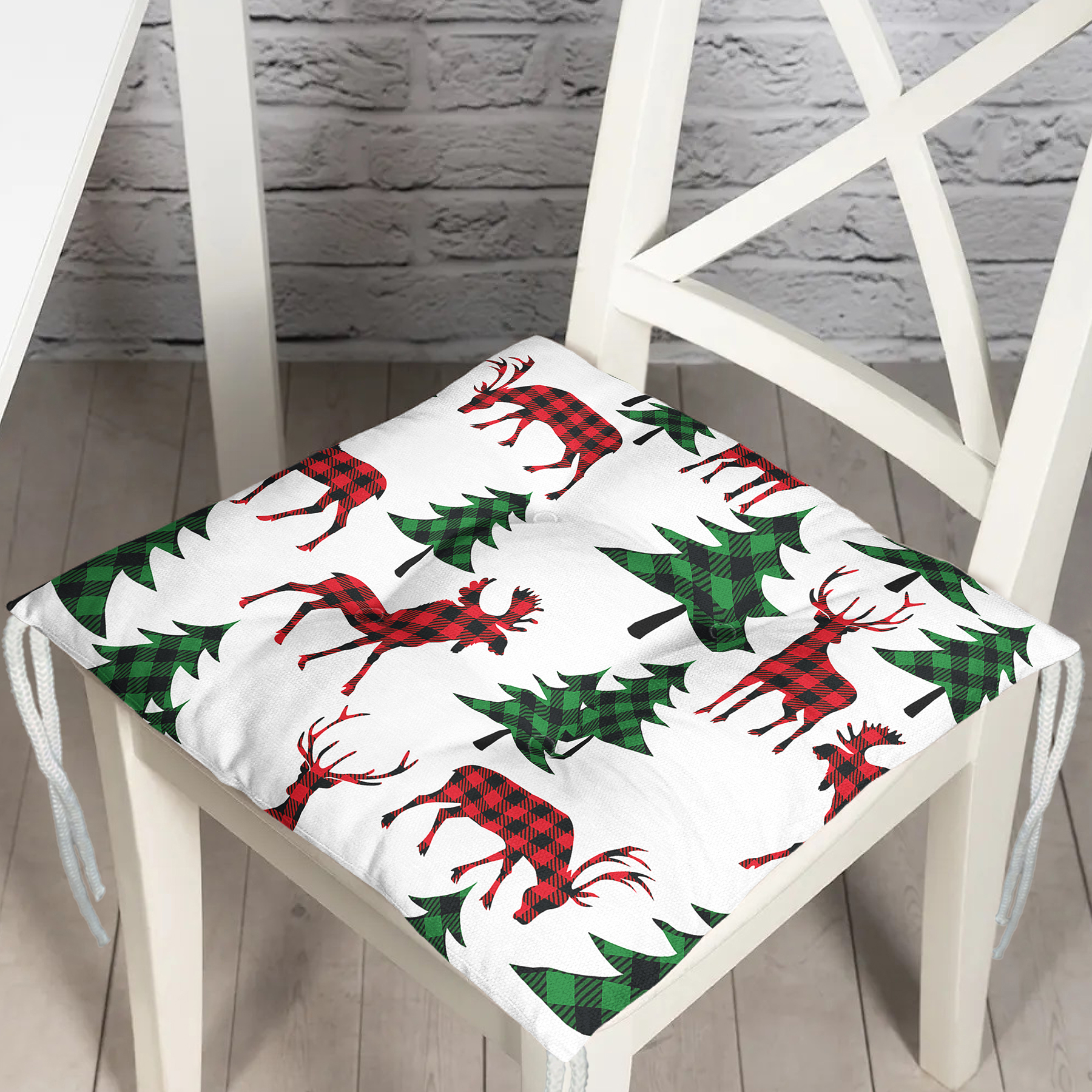 Beyaz Zemin Üzerinde Çam Ağaçlı Ekoseli Geyik Motifli Dijital Baskılı Modern Pofuduk Sandalye Minderi Realhomes