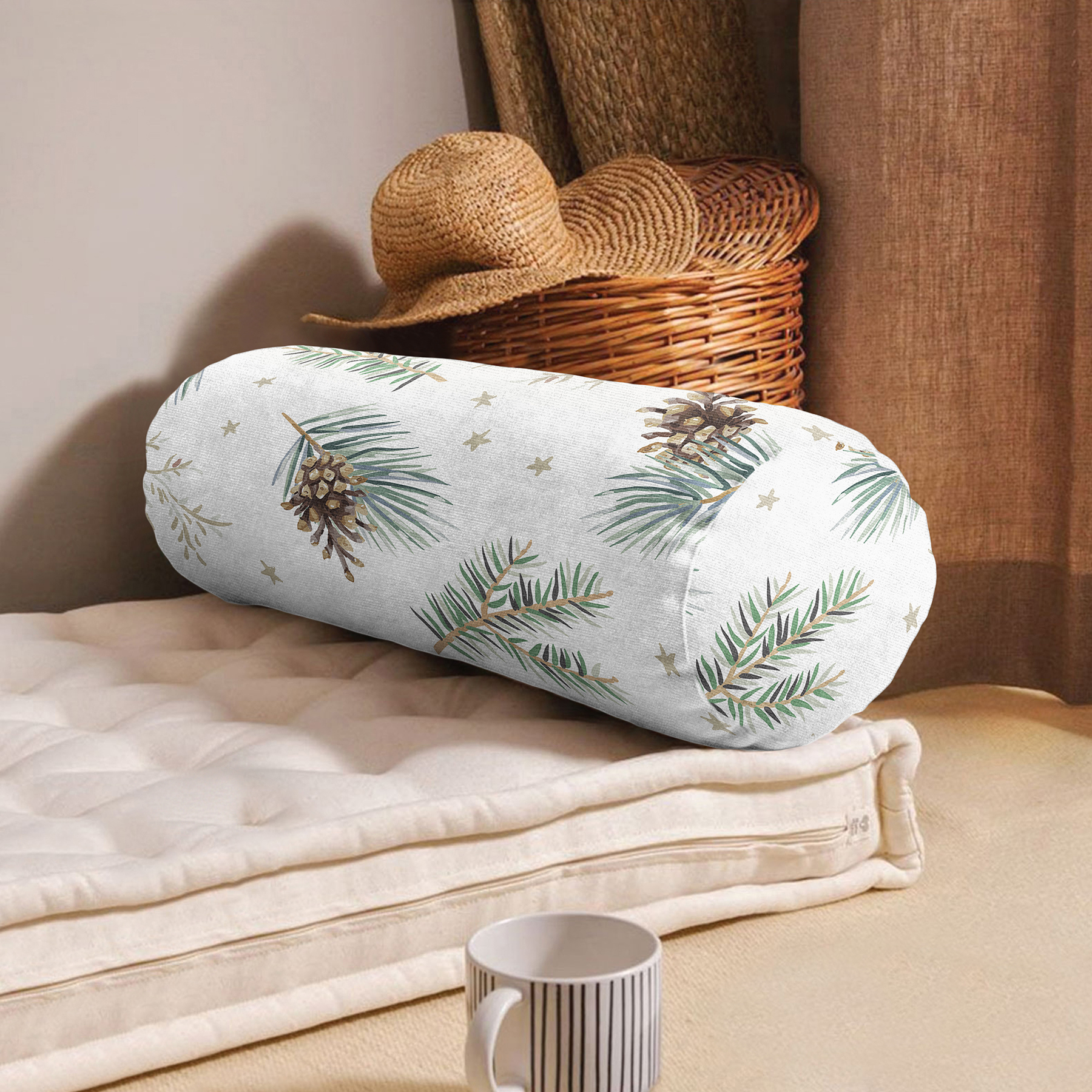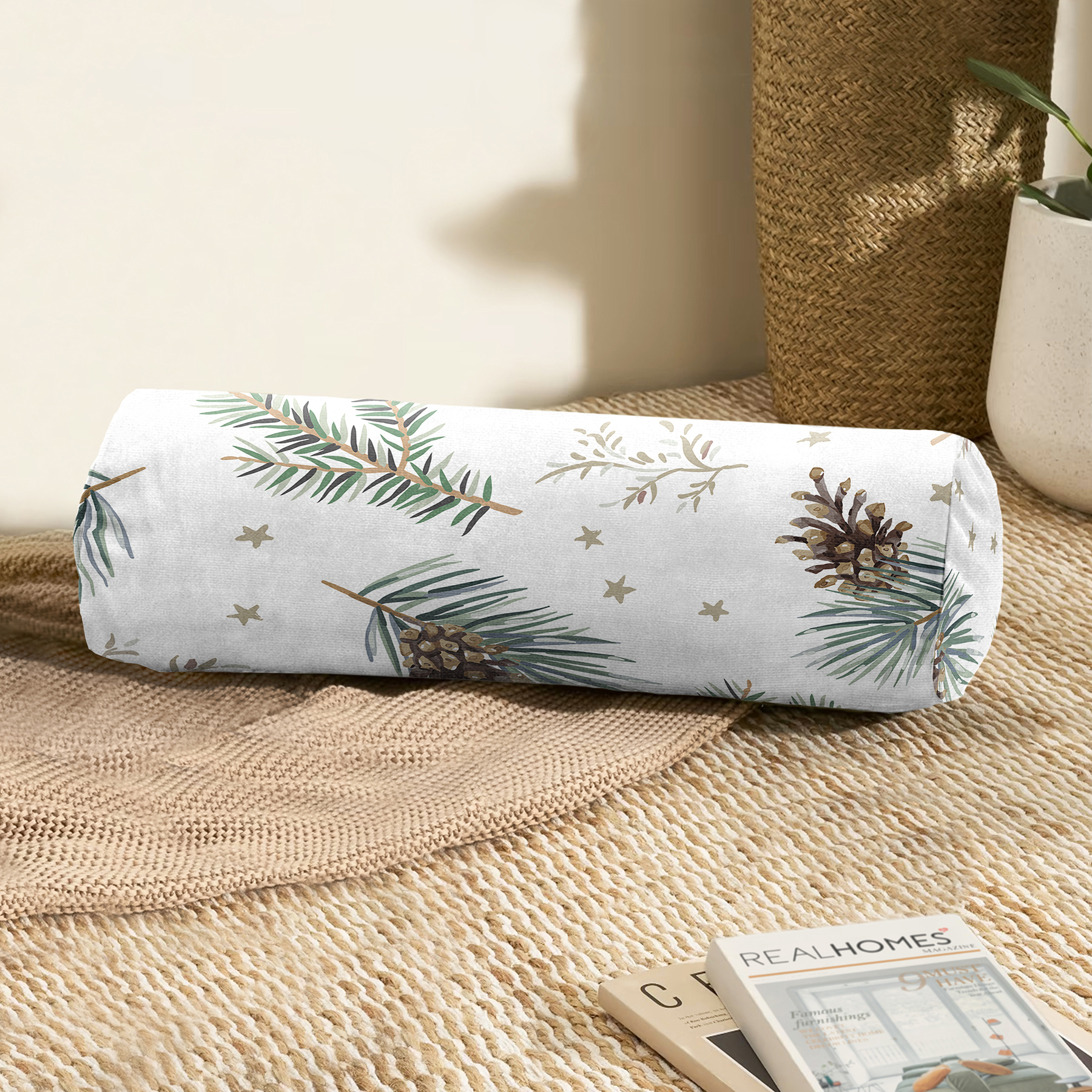 Beyaz Zemin Üzerinde Çam Yaprağı Desenli Dijital Baskılı Modern İç Dolgulu – Fermuarlı Süet Silindir Yuvarlak Yastık Kırlent