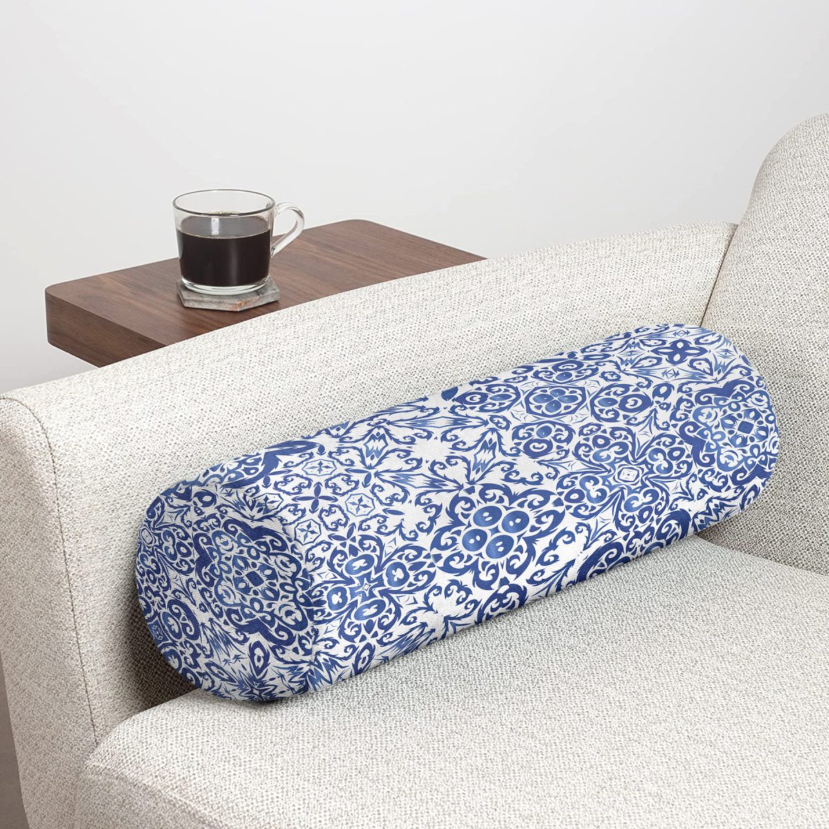 Beyaz Zemin Üzerinde Çini Desenli Dijital Baskılı Modern İç Dolgulu – Fermuarlı Süet Silindir Daire Yastık Kırlent