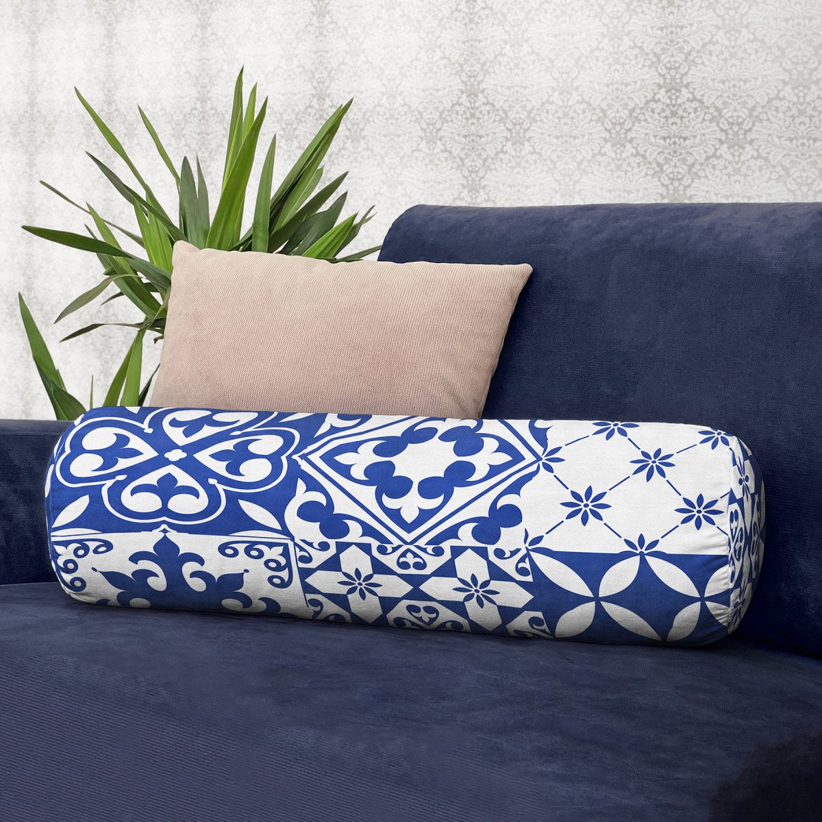 Beyaz Zemin Üzerinde Çini Desenli Dijital Baskılı Modern İç Dolgulu – Fermuarlı Süet Silindir Daire Yastık Kırlent