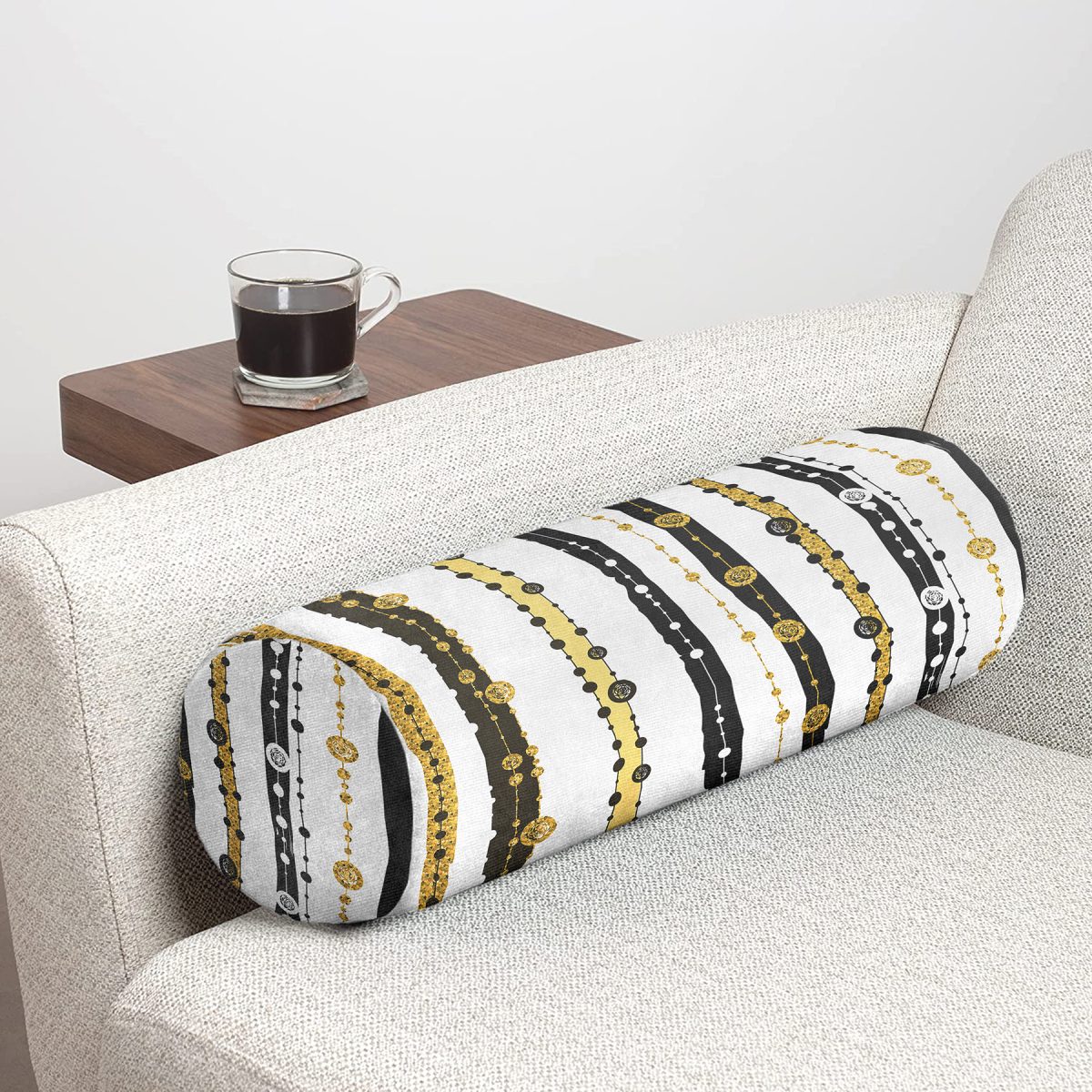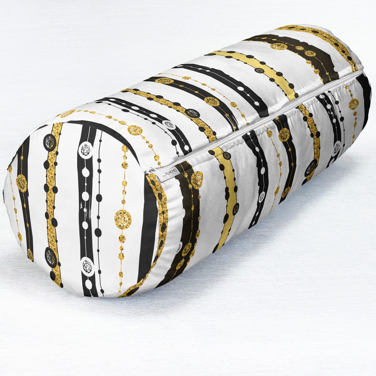 Beyaz Zemin Üzerinde Gold Çizgili Dijital Baskılı Modern İç Dolgulu – Fermuarlı Süet Silindir Daire Yastık Kırlent
