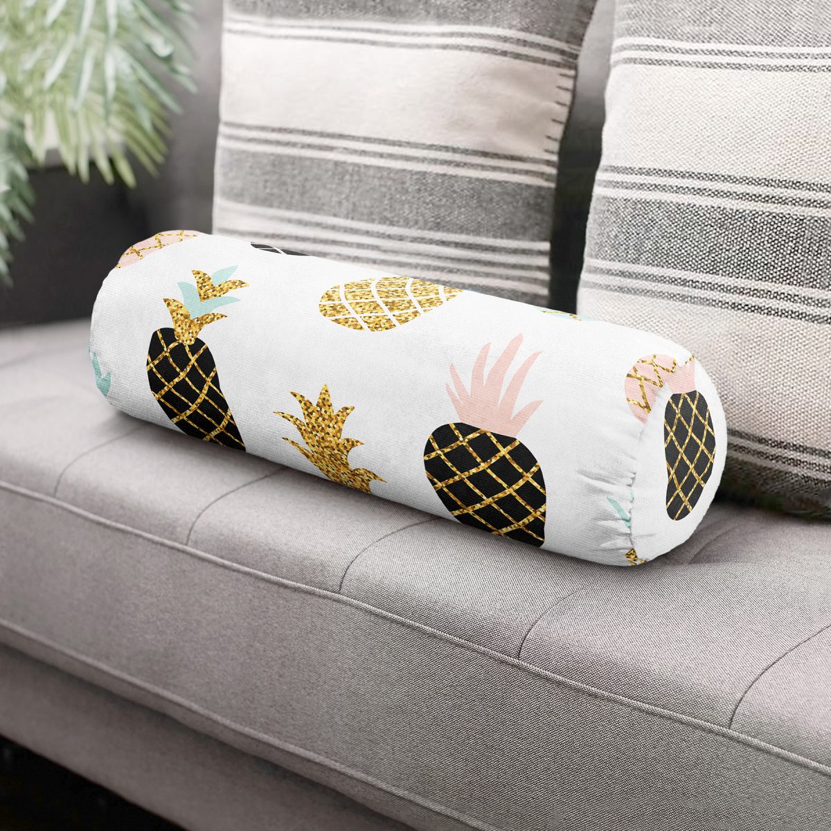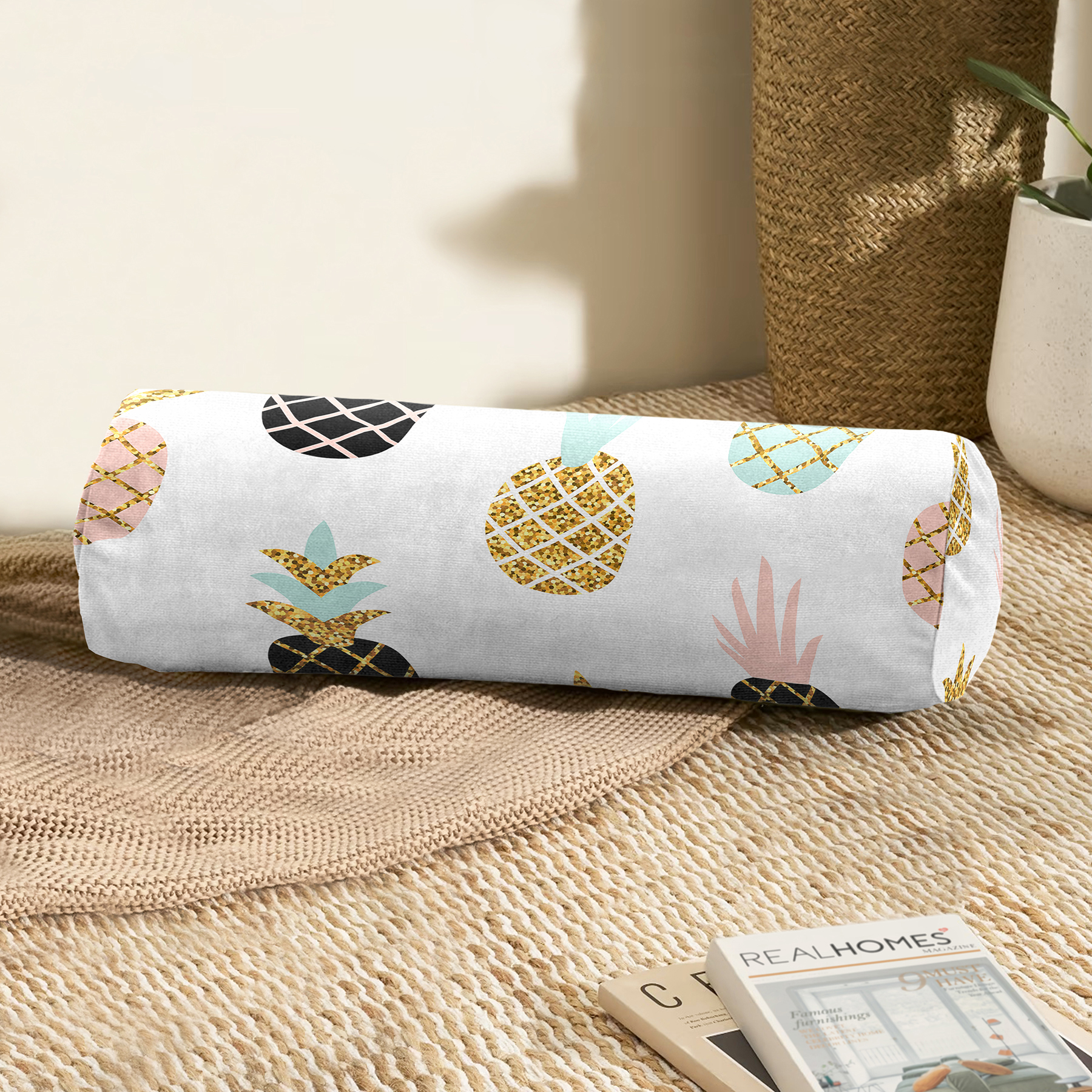 Beyaz Zemin Üzerinde Gold Detaylı Ananas Desenli Dijital Baskılı Modern İç Dolgulu Fermuarlı Çok Amaçlı Silindir Yastık Kırlent