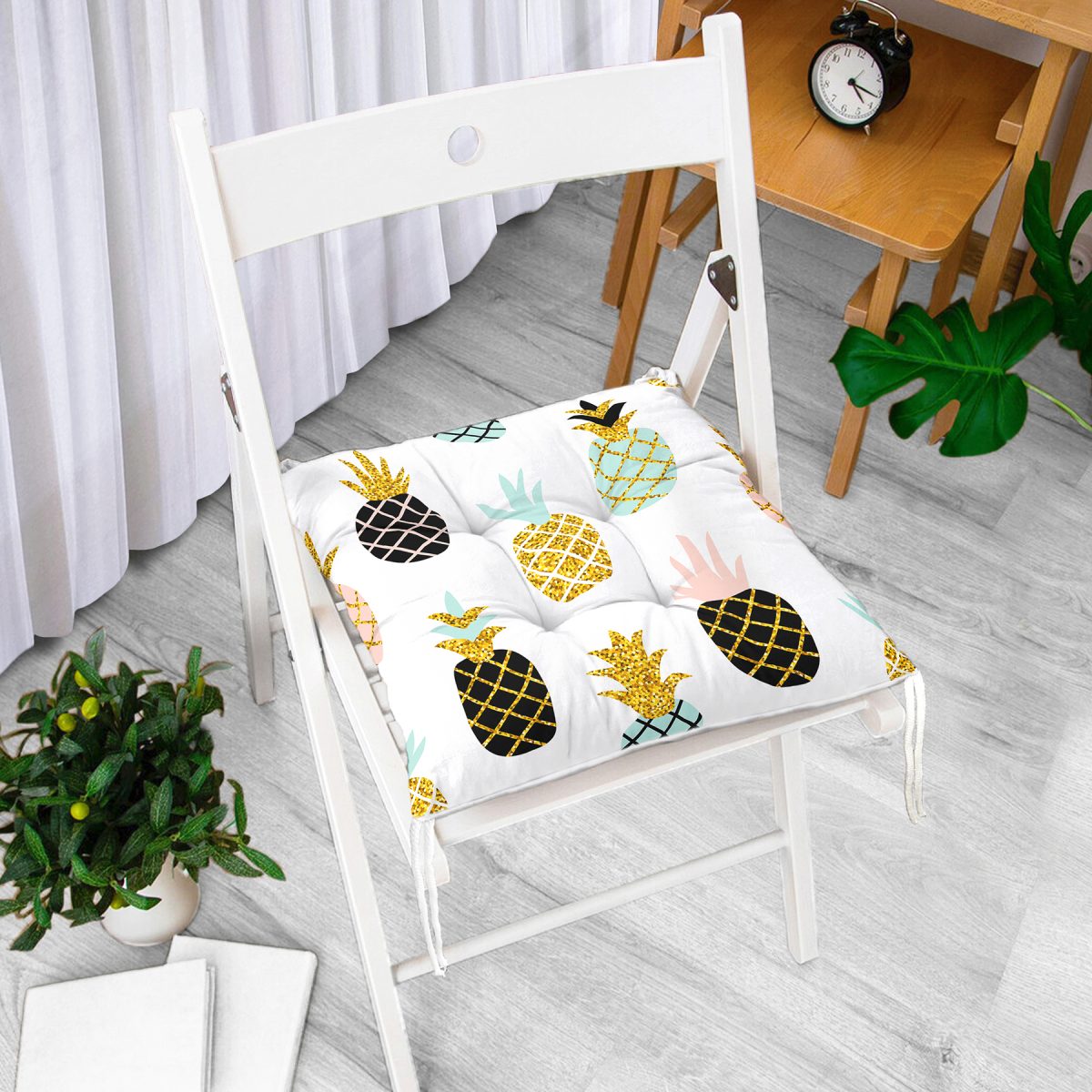 Beyaz Zemin Üzerinde Gold Detaylı Ananas Desenli Dijital Baskılı Modern Pofuduk Sandalye Minderi
