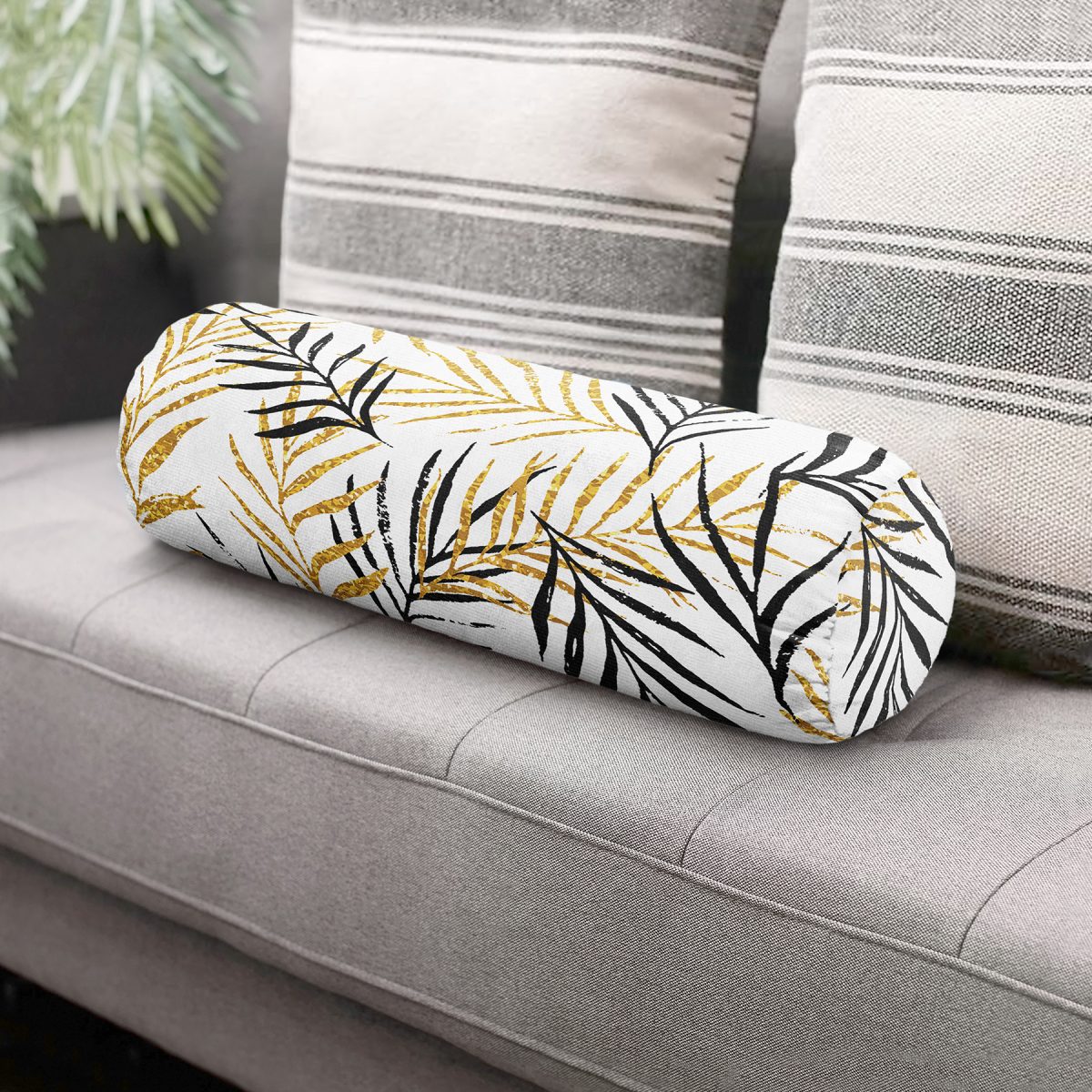 Beyaz Zemin Üzerinde Gold Detaylı Yaprak Desenli Dijital Baskılı Modern İç Dolgulu Süet Silindir Yastık Kırlent – Bel Yastığı
