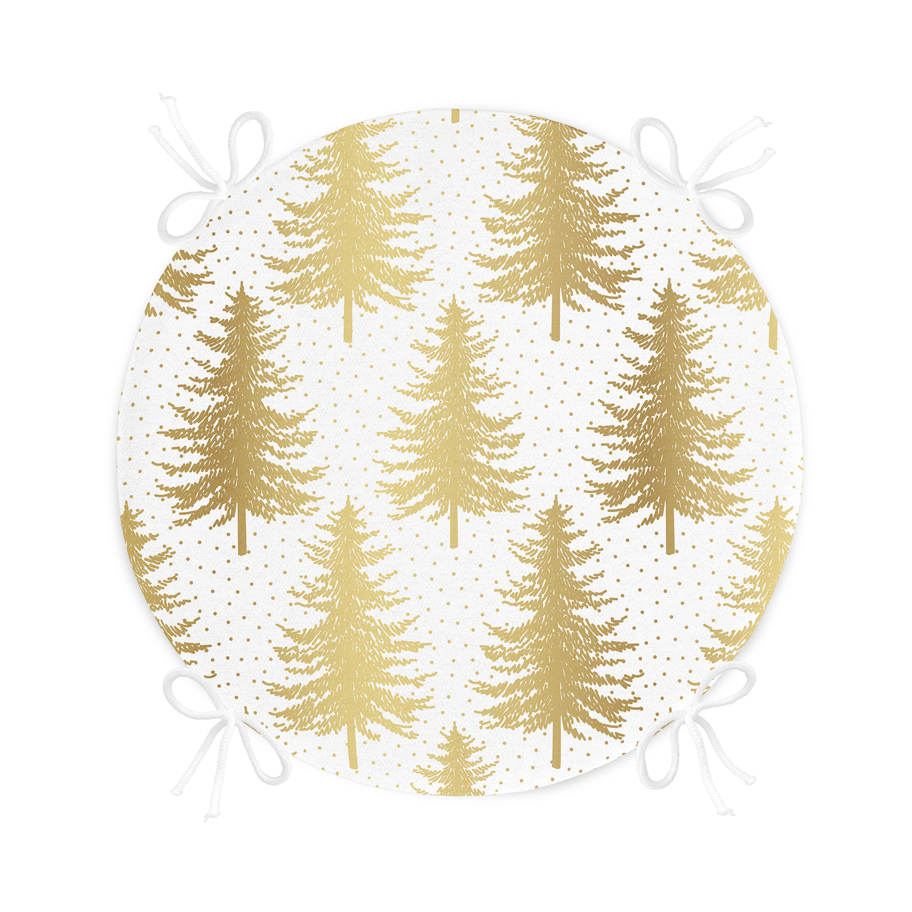 Beyaz Zemin Üzerinde Gold Renkli Çam Ağacı Desenli Dijital Baskılı Modern Yuvarlak Fermuarlı Sandalye Minderi