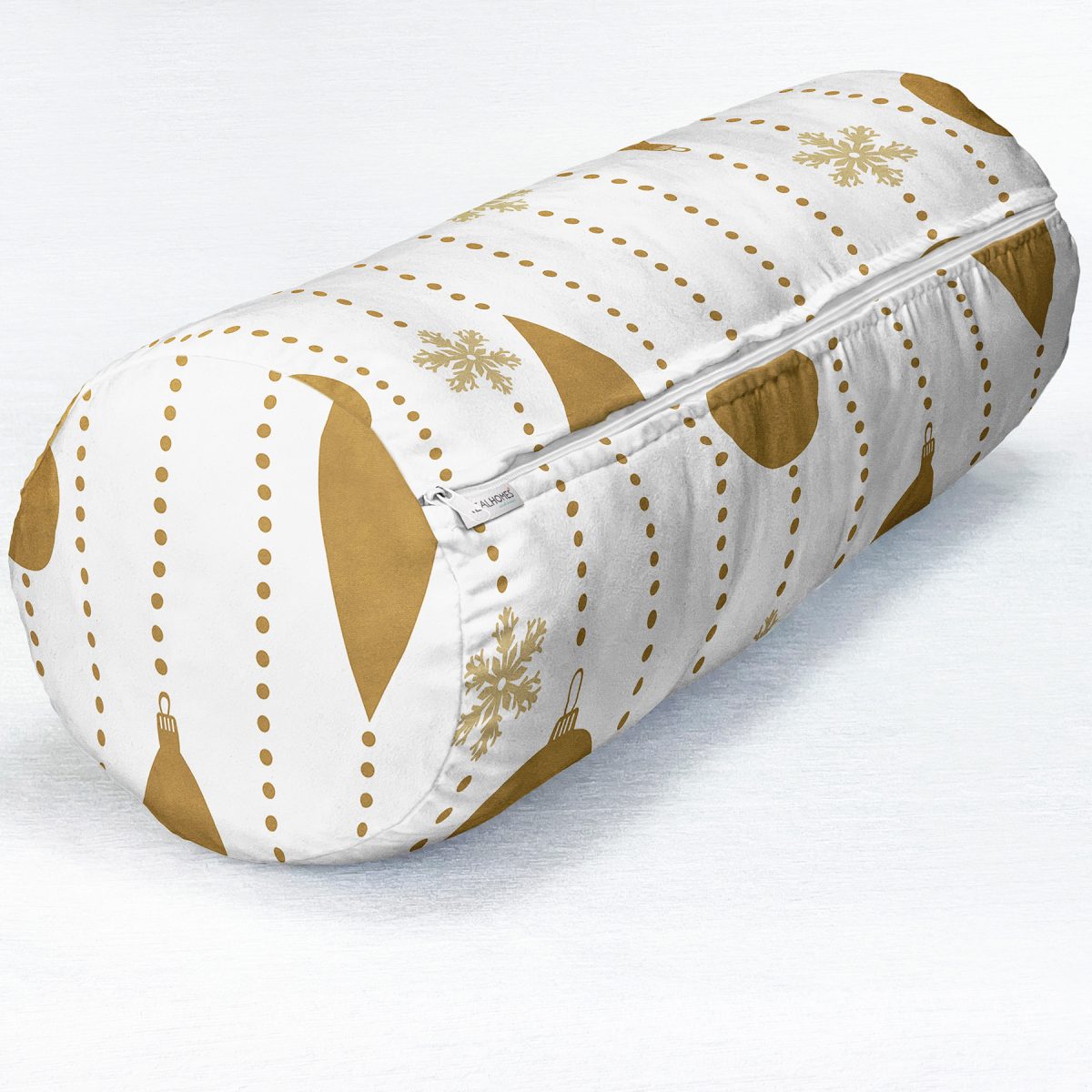 Beyaz Zemin Üzerinde Gold Renkli Yılbaşı Temalı Dijital Baskılı Modern İç Dolgulu Fermuarlı Çok Amaçlı Silindir Yastık Kırlent
