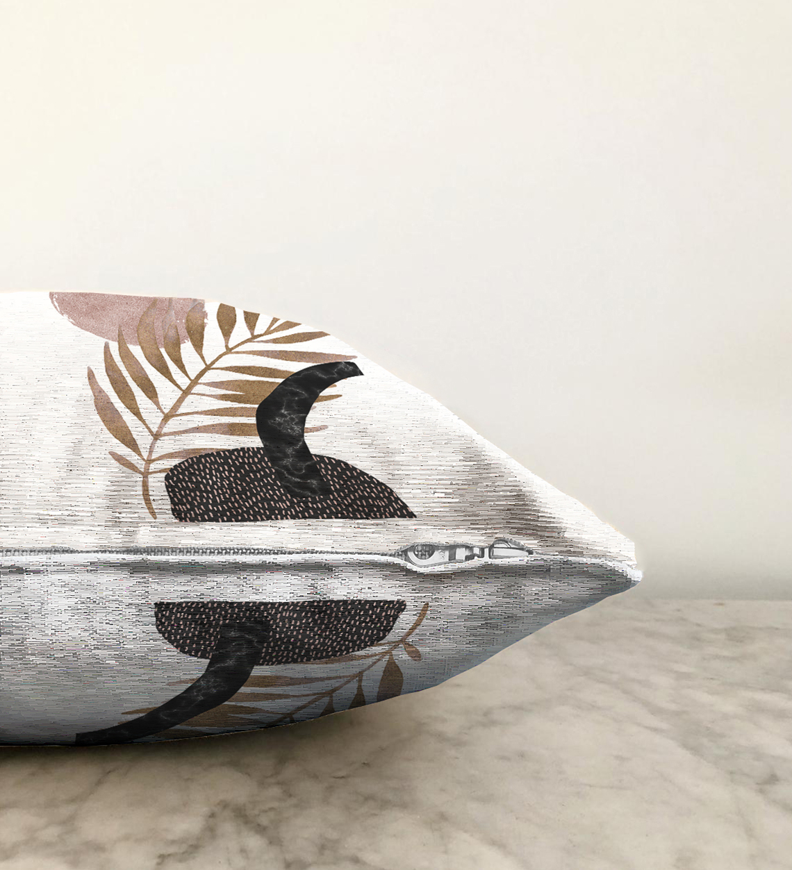 Beyaz Zemin Üzerinde Gold Yaprak Motifli Dekoratif Raşel Kadife Yastık Kılıfı