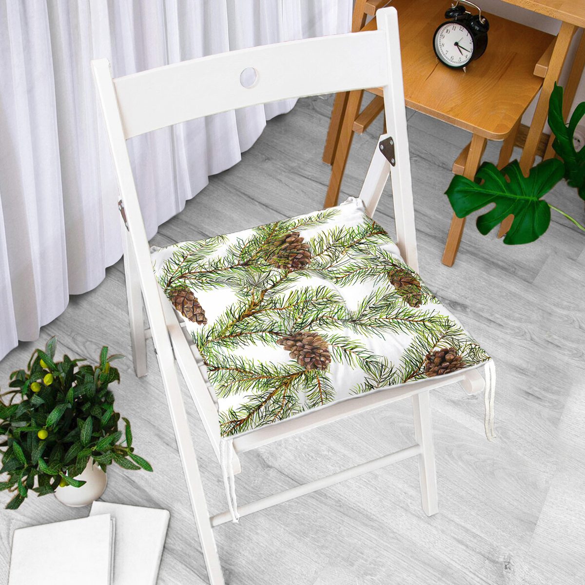 Beyaz Zemin Üzerinde Kozalak Desenli Dijital Baskılı Modern Pofuduk Sandalye Minderi Realhomes