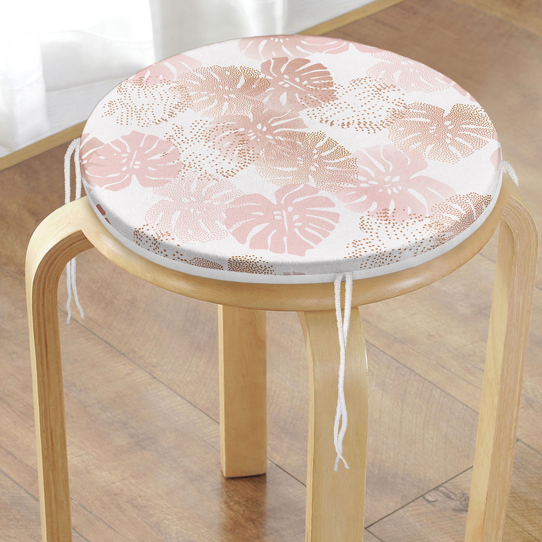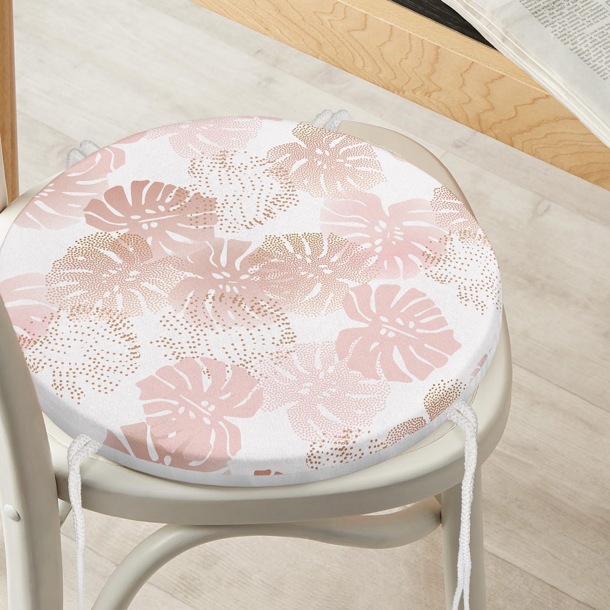 Beyaz Zemin Üzerinde Pembe Tropikal Yaprak Desenli Modern Yuvarlak Fermuarlı Sandalye Minderi