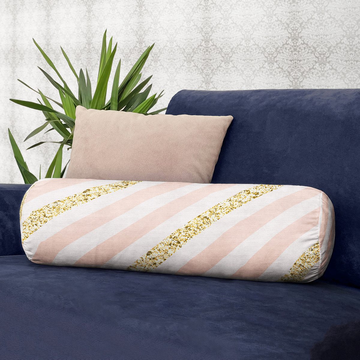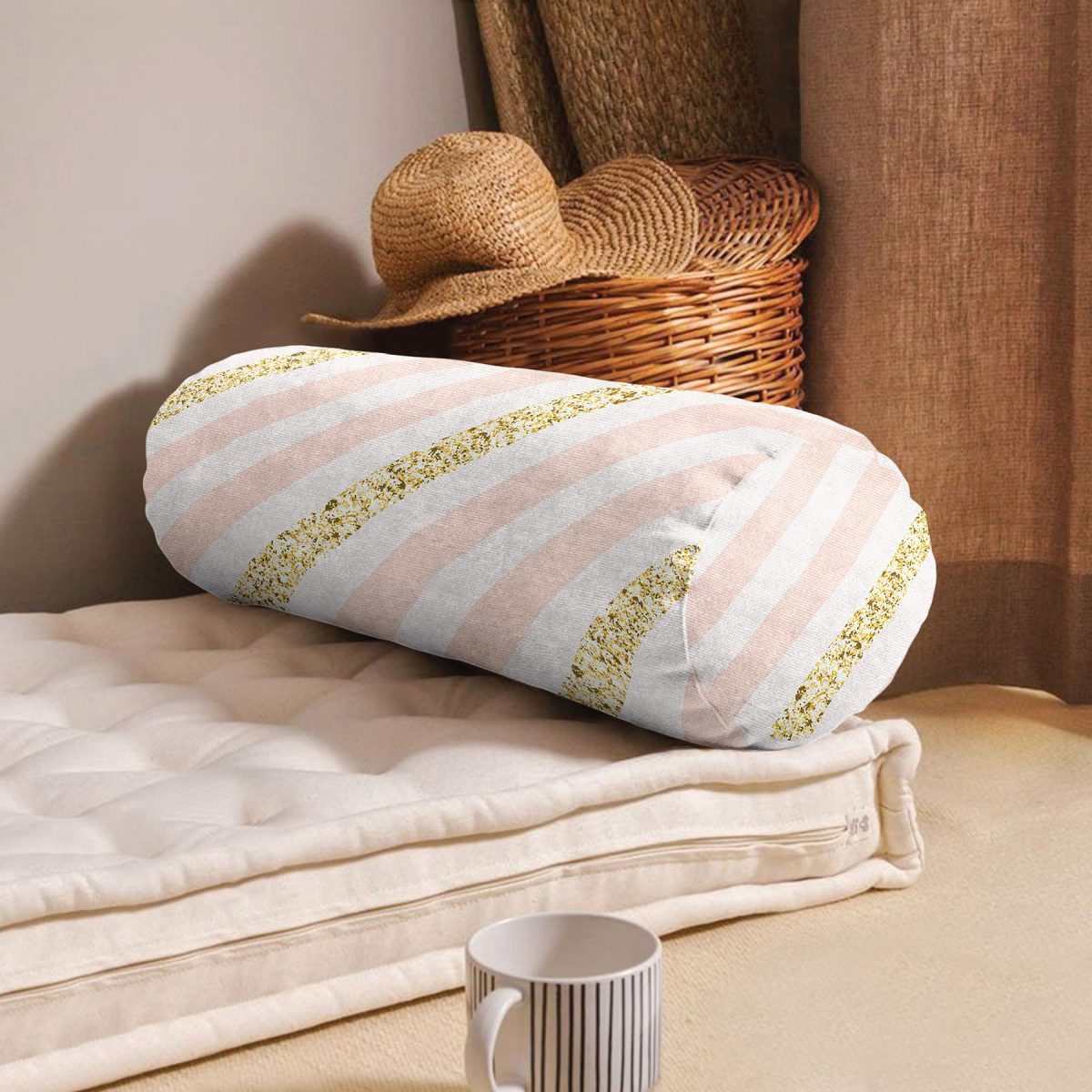 Beyaz Zemin Üzerinde Pembe Yatay Çizgili Dijital Baskılı Modern İç Dolgulu Süet Silindir Yastık Kırlent – Bel Yastığı