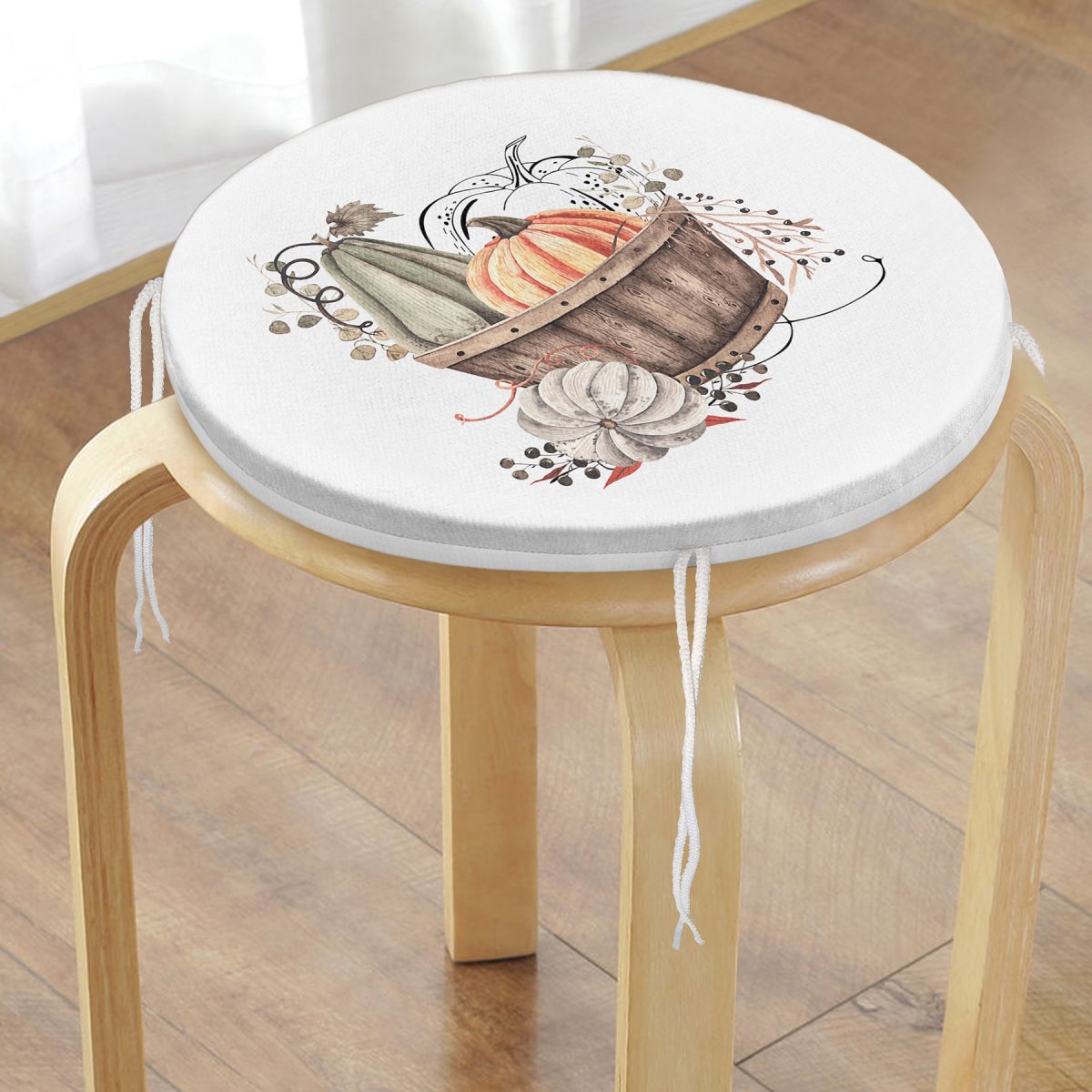 Beyaz Zemin Üzerinde Renkli Balkabağı Desenli Dijital Baskılı Modern Yuvarlak Fermuarlı Sandalye Minderi
