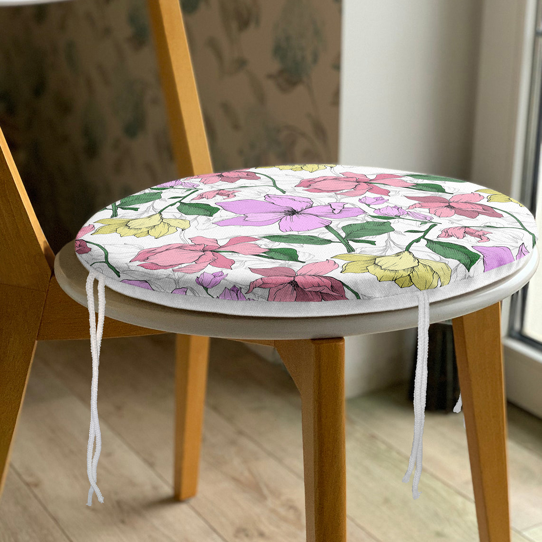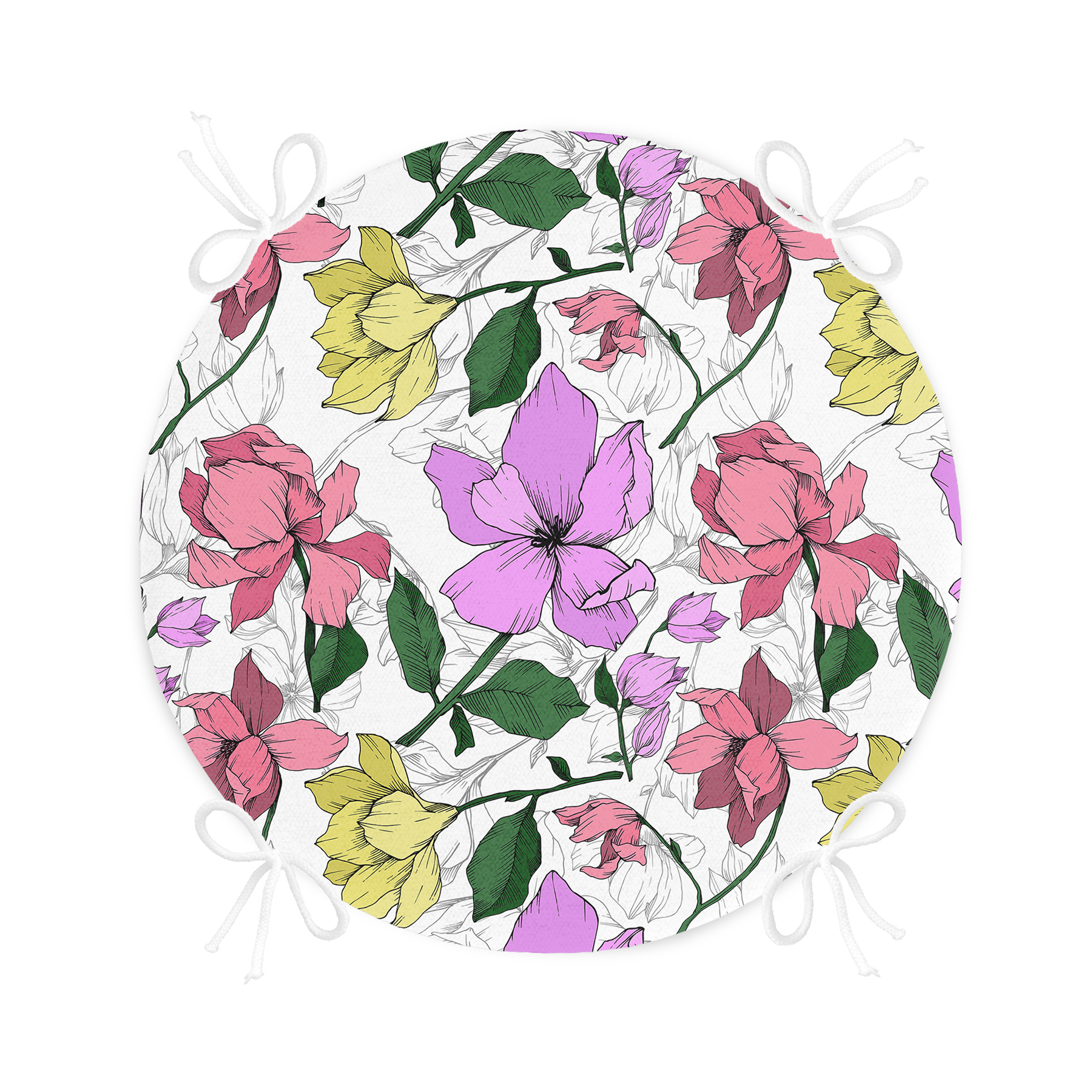 Beyaz Zemin Üzerinde Renkli Çiçek Desenli Dijital Baskılı Modern Yuvarlak Fermuarlı Sandalye Minderi