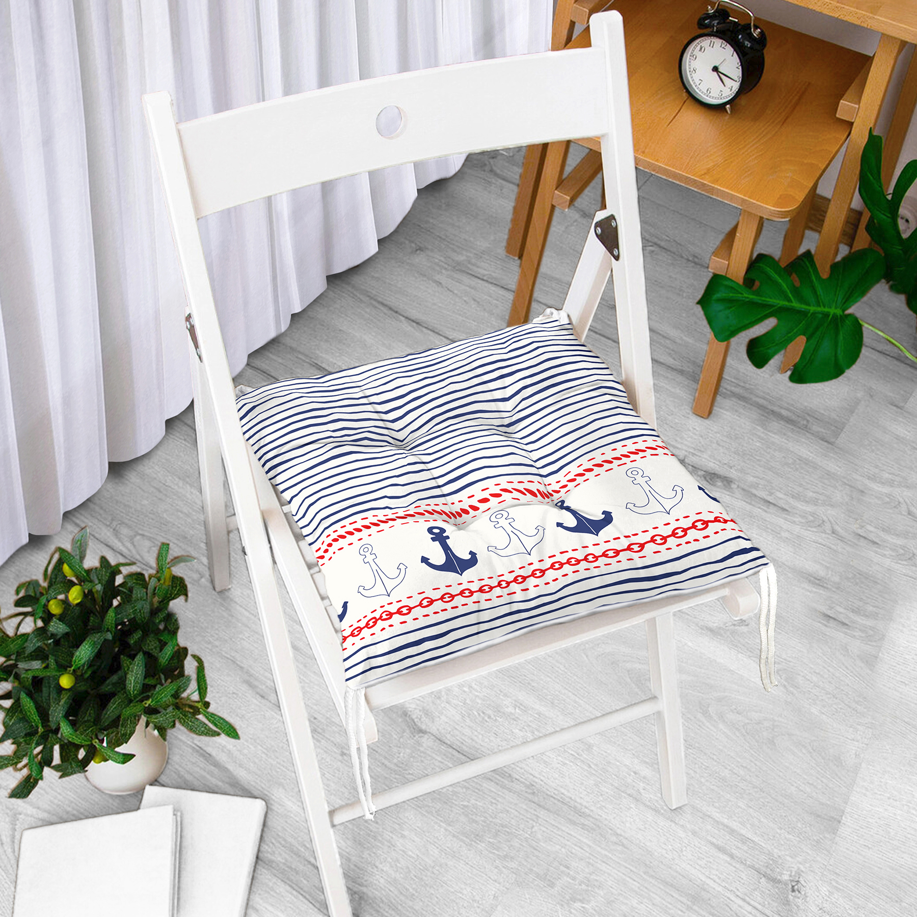 Beyaz Zemin Üzerinde Renkli Çizgili Çapa Desenli Dijital Baskılı Modern Pofuduk Sandalye Minderi