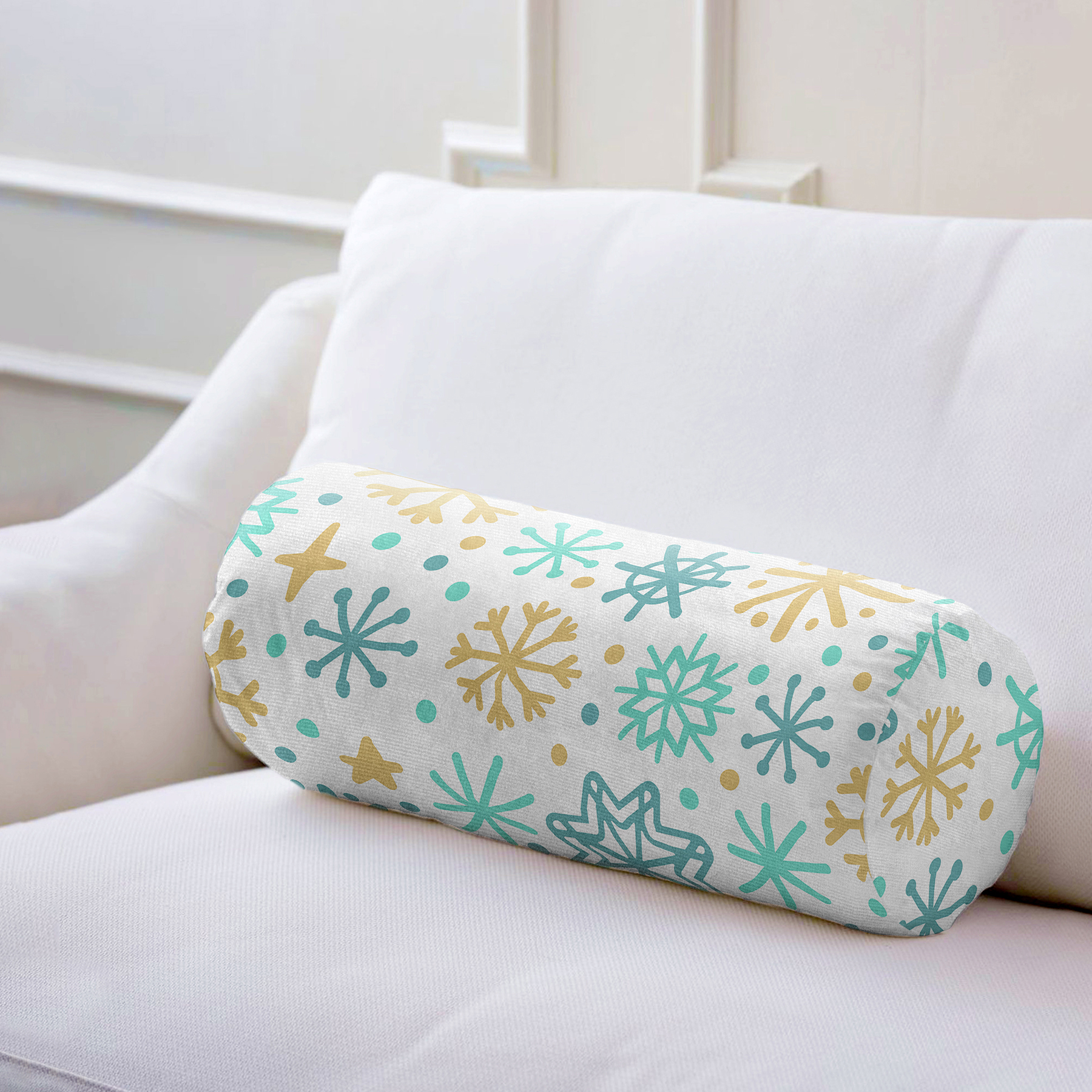 Beyaz Zemin Üzerinde Renkli Geometrik Desenli Dijital Baskılı Modern İç Dolgulu – Fermuarlı Süet Silindir Rulo Yastık Kırlent