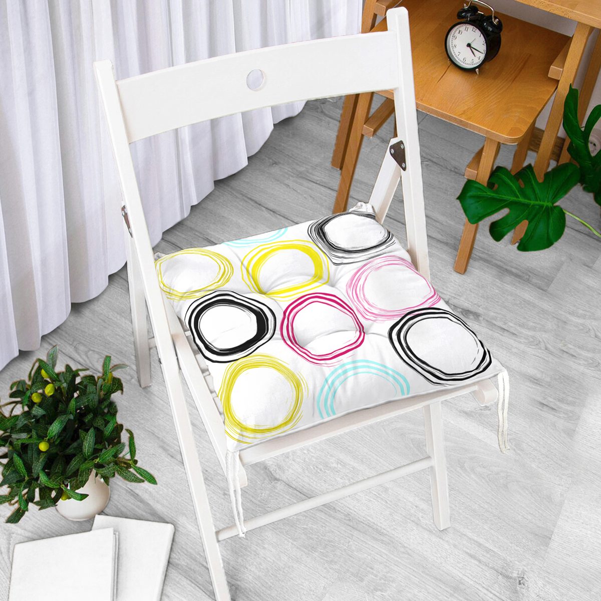 Beyaz Zemin Üzerinde Renkli Geometrik Desenli Dijital Baskılı Modern Pofuduk Sandalye Minderi