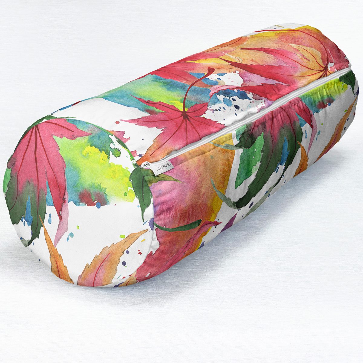 Beyaz Zemin Üzerinde Renkli Yaprak Desenli Dijital Baskılı Modern İç Dolgulu Yumuşak Silindir Form Yastık Kırlent