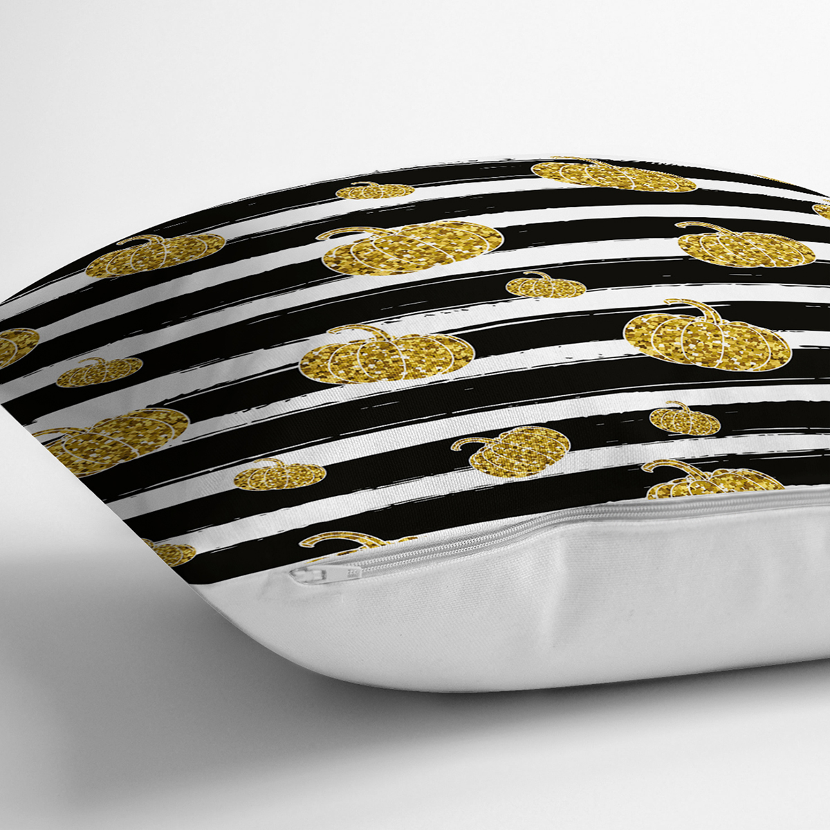 Beyaz Zemin Üzerinde Siyah Çizgili Gold Detaylı Bal Kabağı Yastık Kırlent Kılıfı