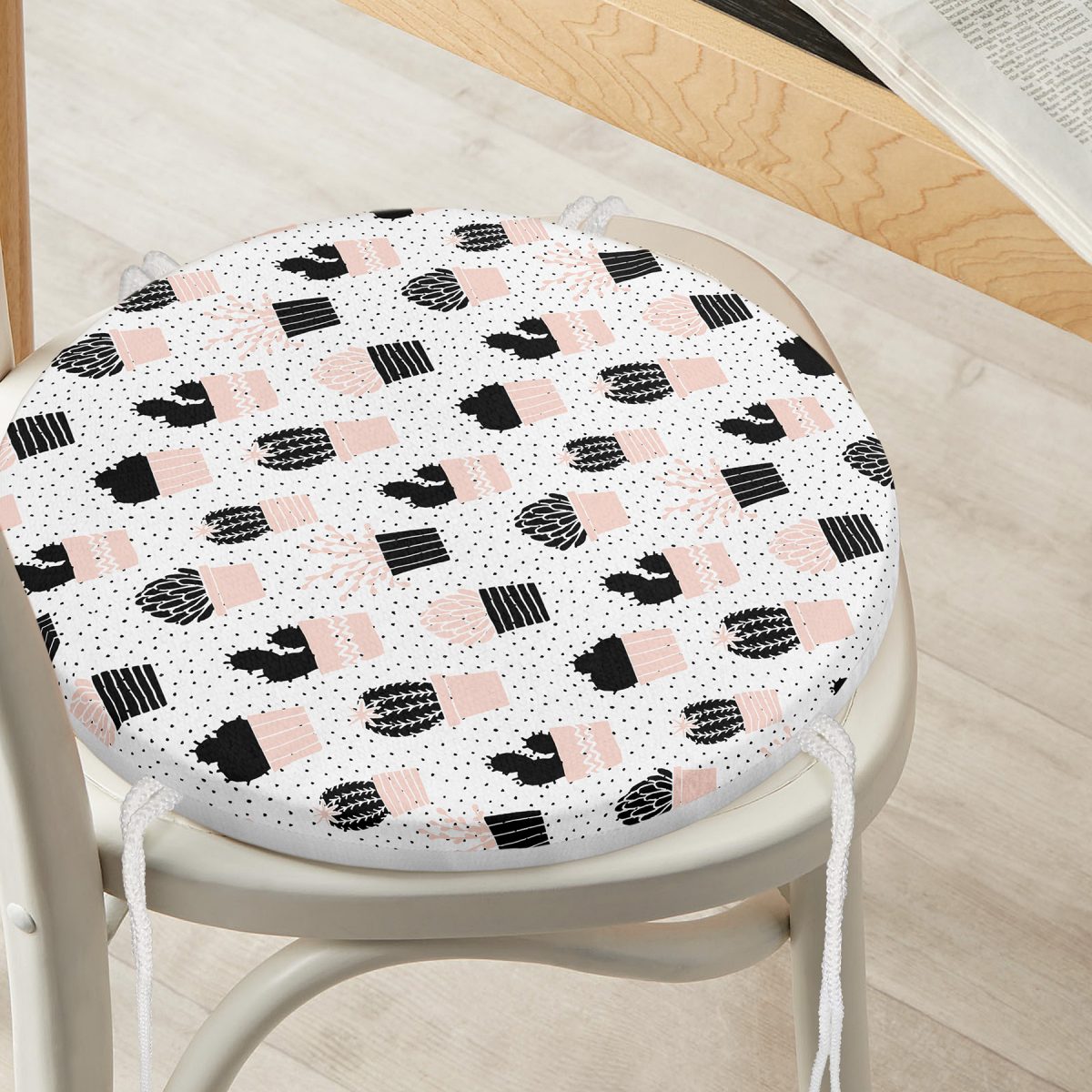 Beyaz Zemin Üzerinde Siyah Puantiyeli Kaktüs Desenli Dijital Baskılı Modern Yuvarlak Fermuarlı Sandalye Minderi