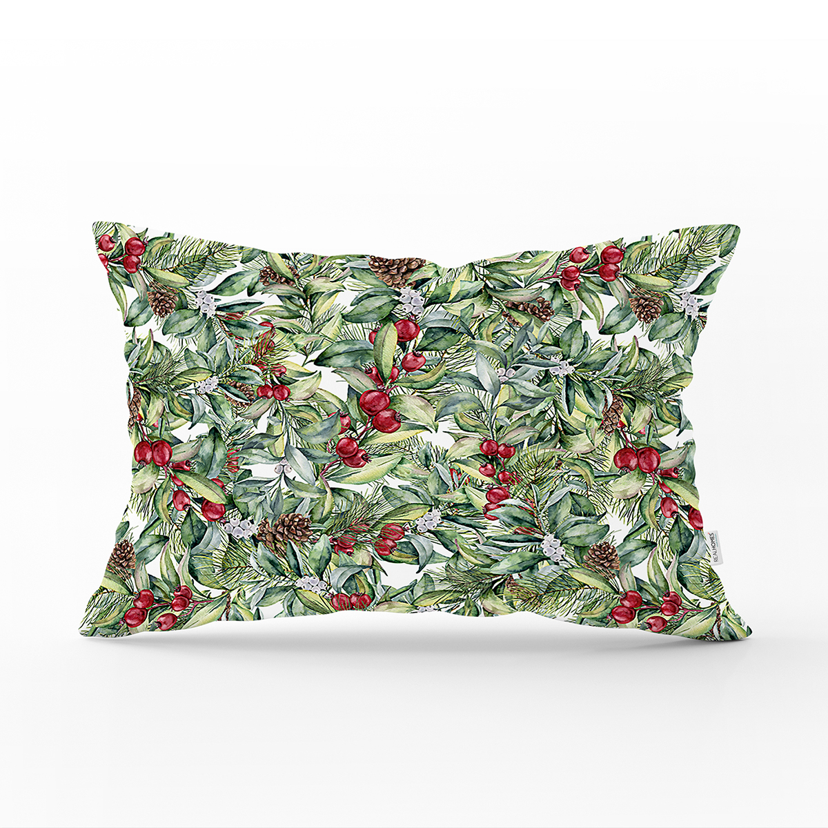 Beyaz Zemin Üzerinde Yaprak Desenli Kiraz Motifli Modern Dikdörtgen Yastık Kırlent Kılıfı