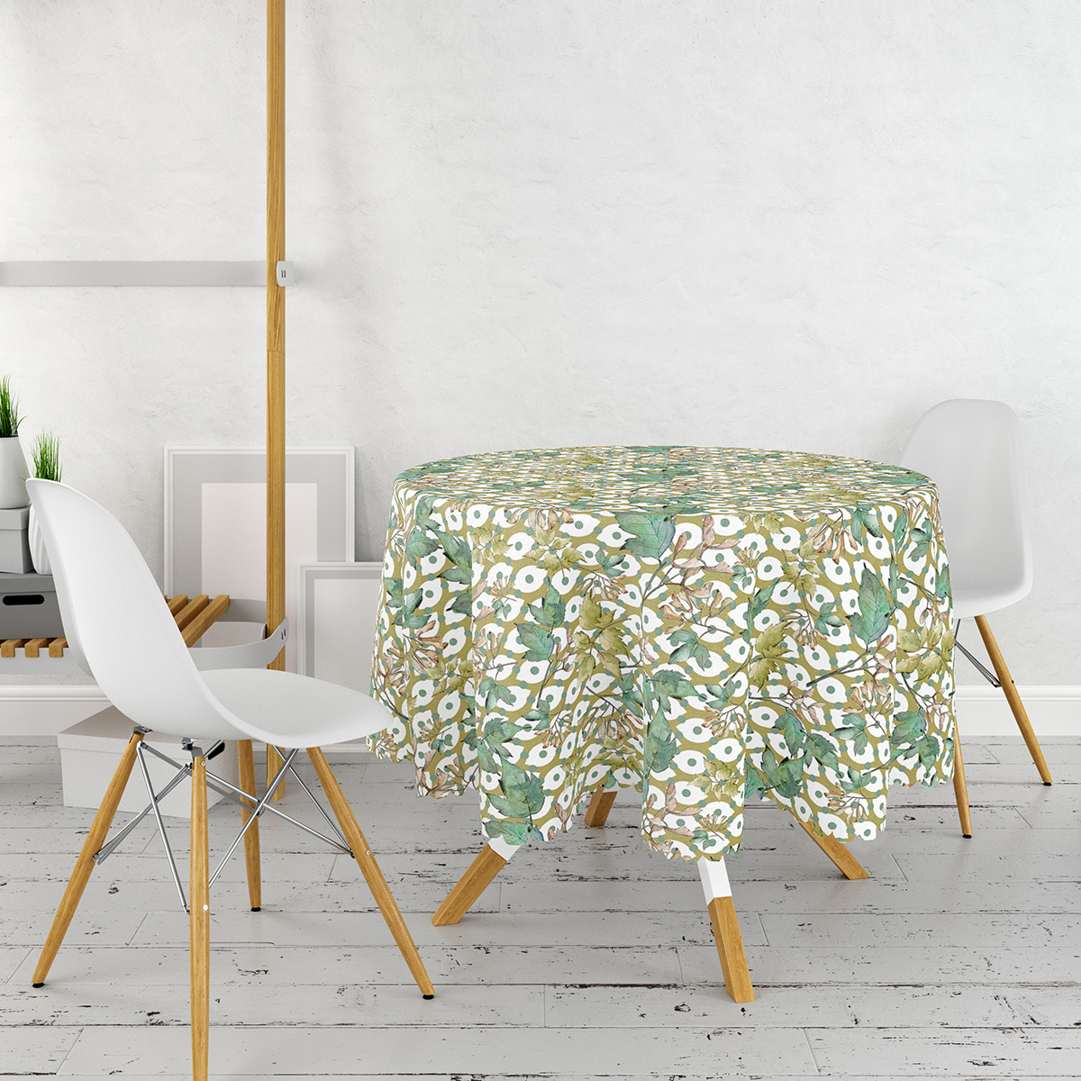Beyaz Zemin Üzerinde Yeşil Puantiyeli Yaprak Desenli Yuvarlak Masa Örtüsü – Çap 140cm