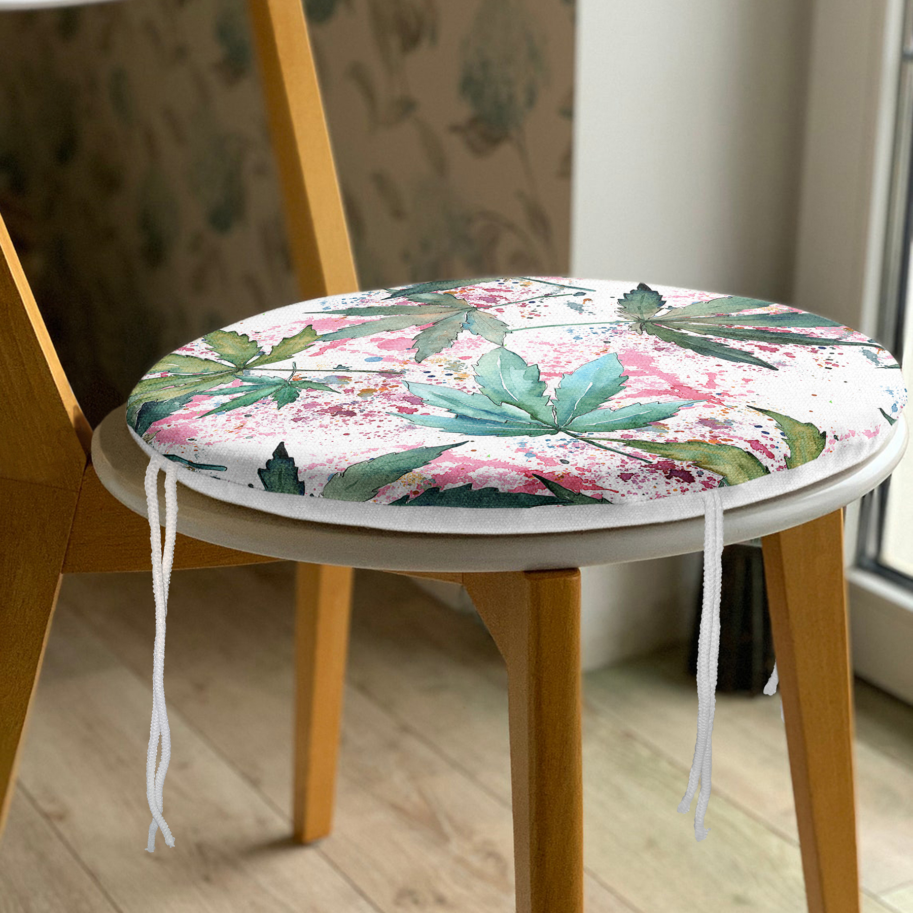 Beyaz Zemin Üzerinde Yeşil Yaprak Desenli Dijital Baskılı Modern Yuvarlak Fermuarlı Sandalye Minderi