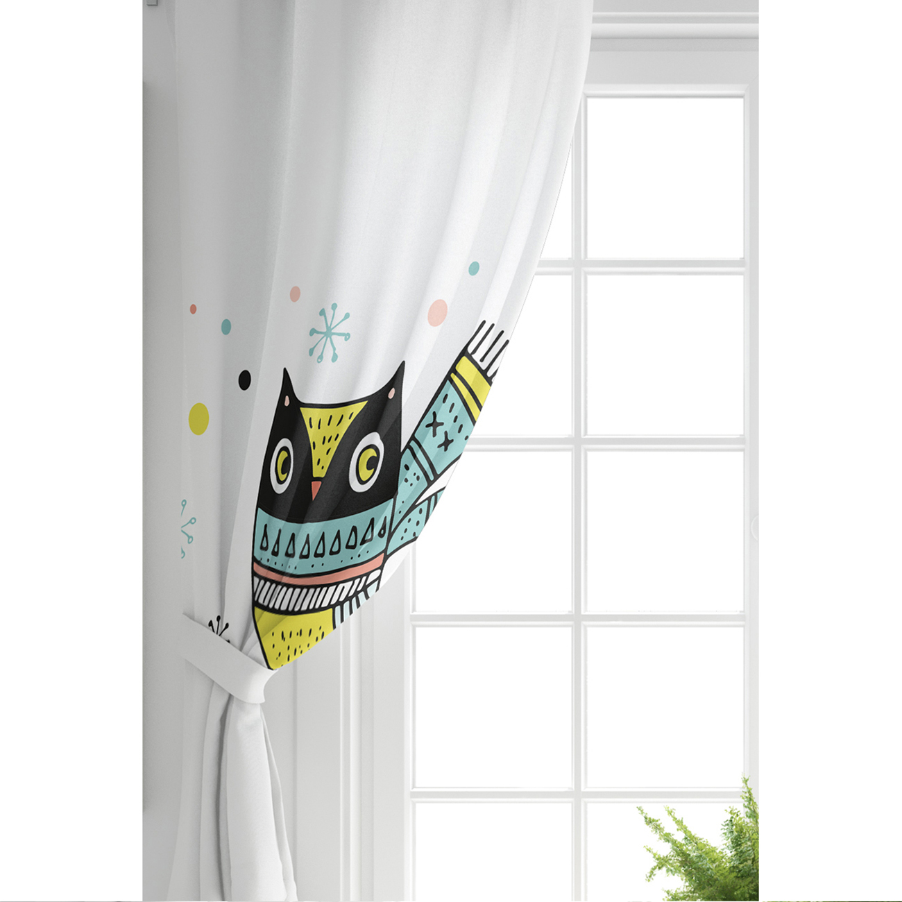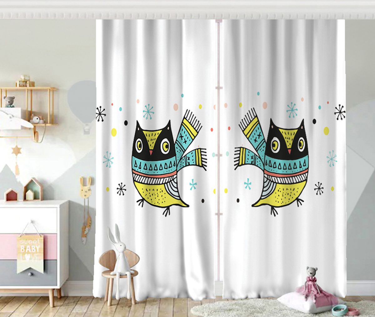 Beyaz Zeminde Atkılı Baykuş Desenli Bebek Odası Fon Perde