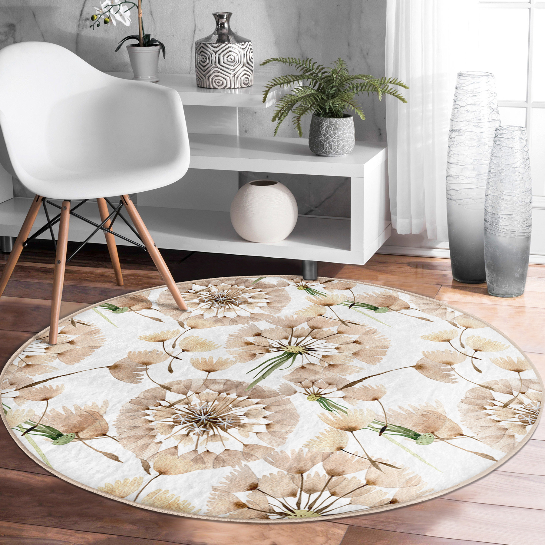 Beyaz Zeminde Çiçek Desenli Dijital Baskılı Modern Krem Koridor ve Antre Yıkanabilir Kaymaz Tabanlı Yuvarlak Halı