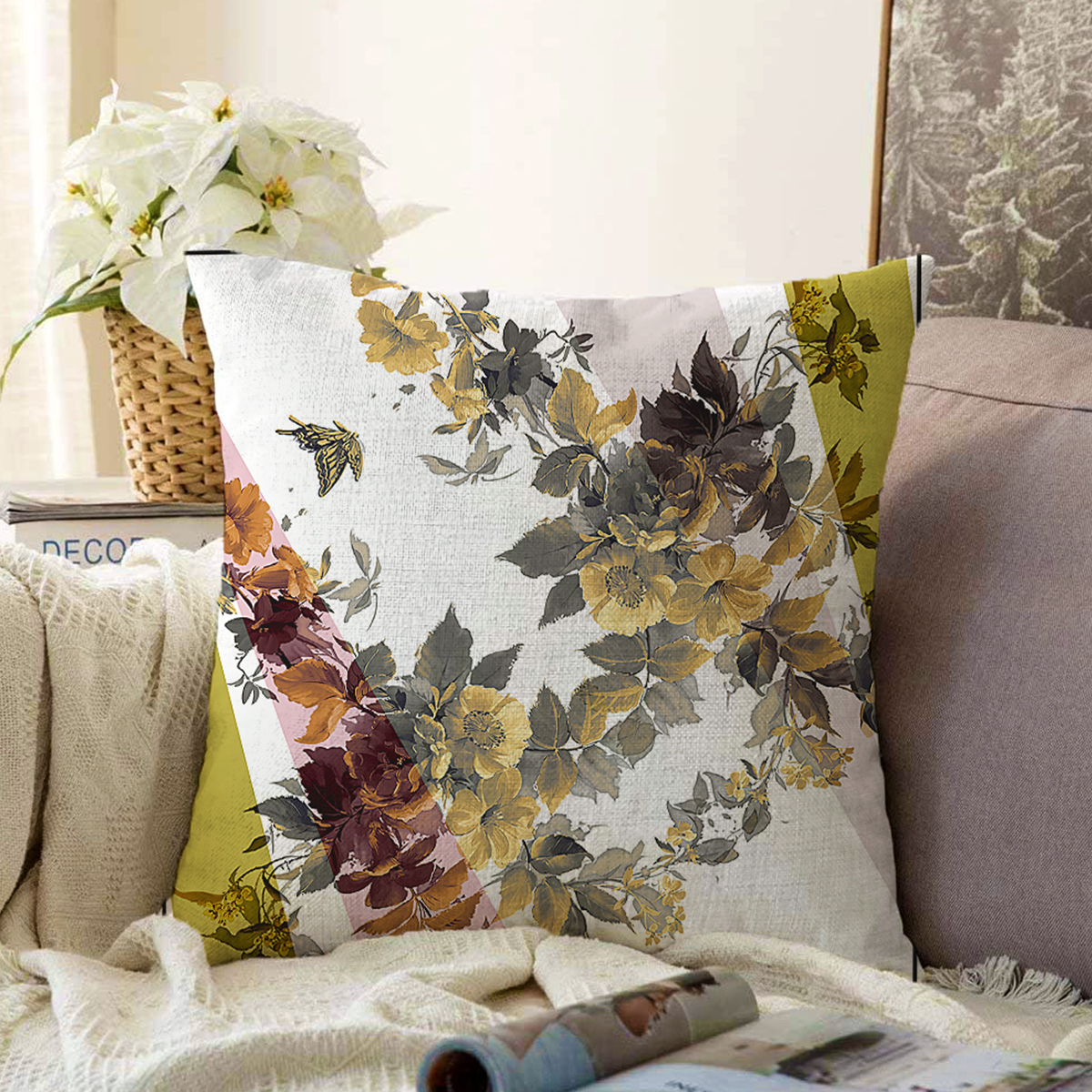 Beyaz Zeminde Çiçek Desenli Özel Tasarım Dijital Baskılı Modern Şönil Yastık Kırlent Kılıfı