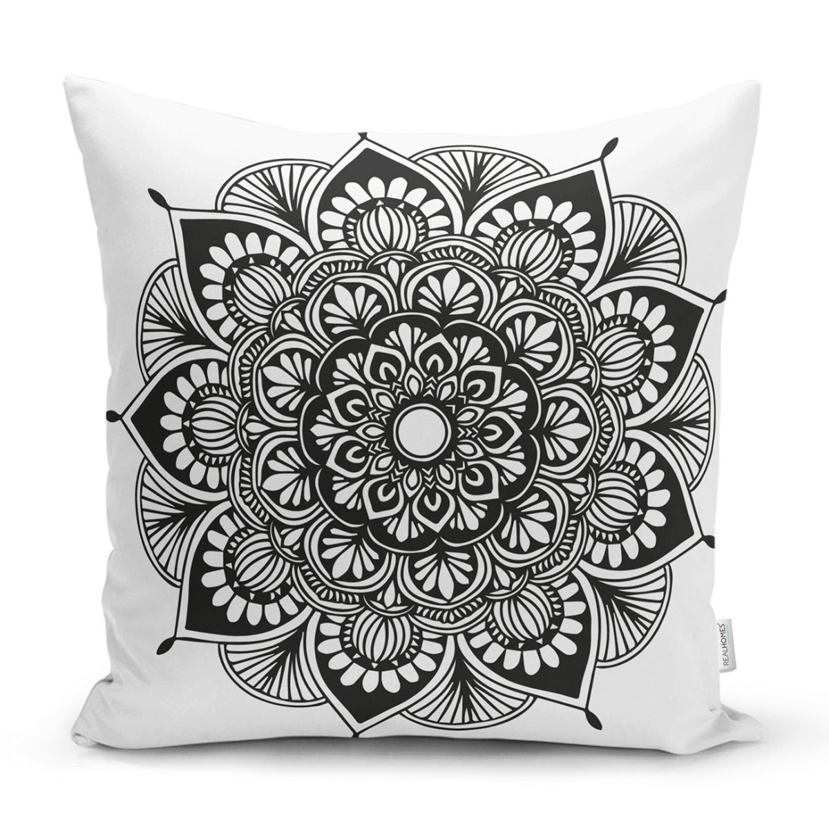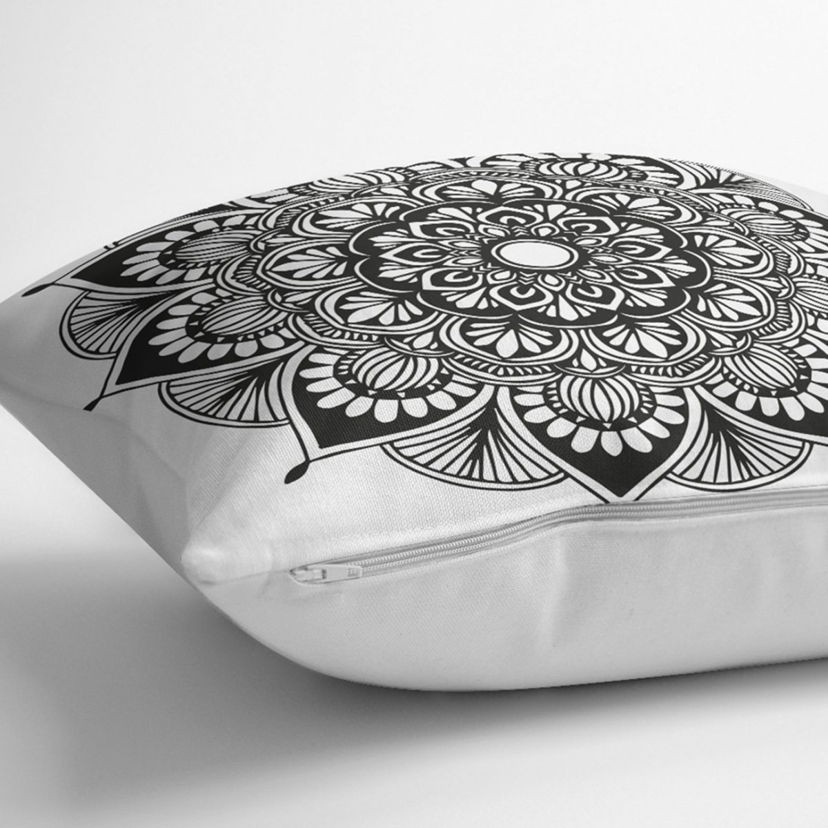 Beyaz Zeminde Çiçek Mandala Desenli Kırlent Kılıfı