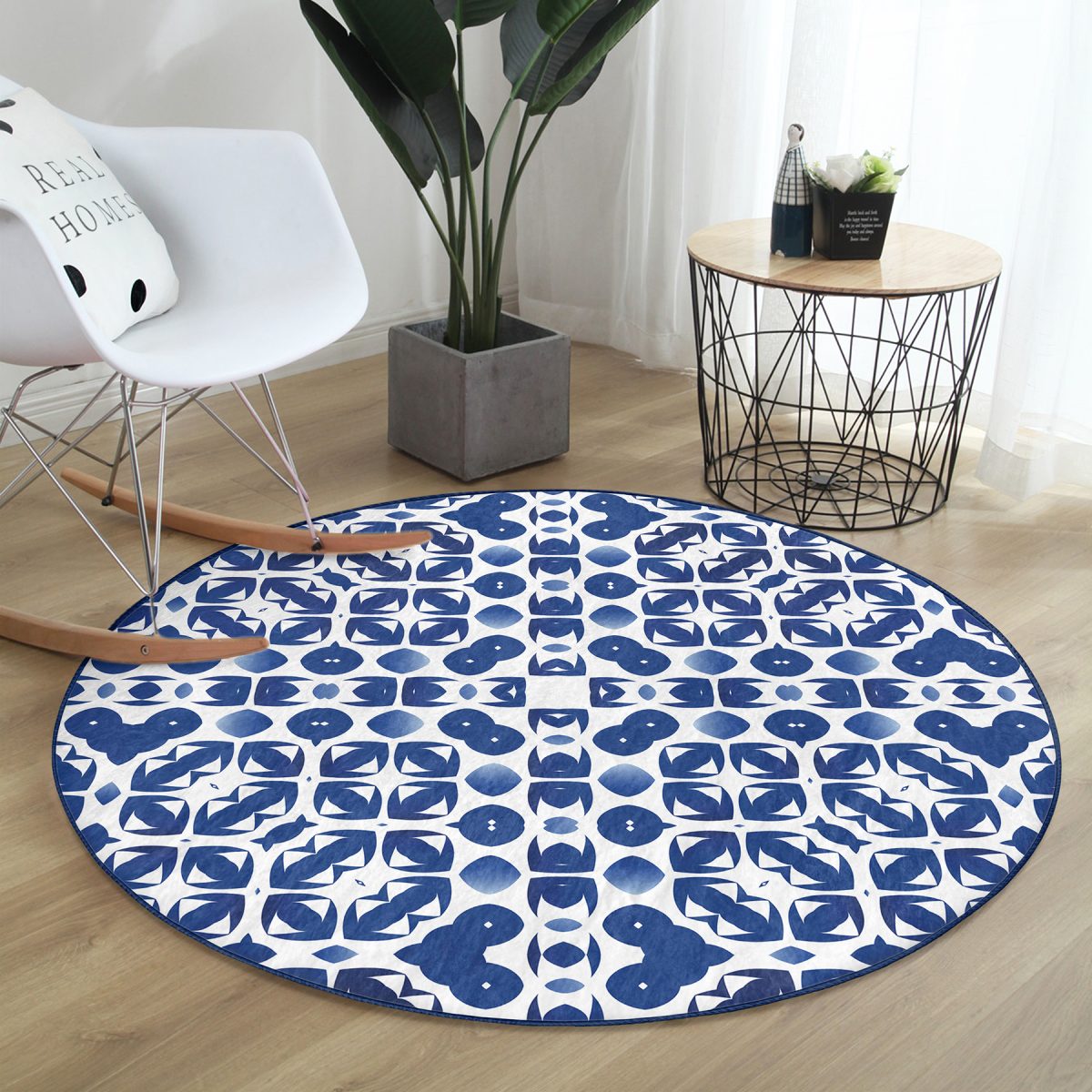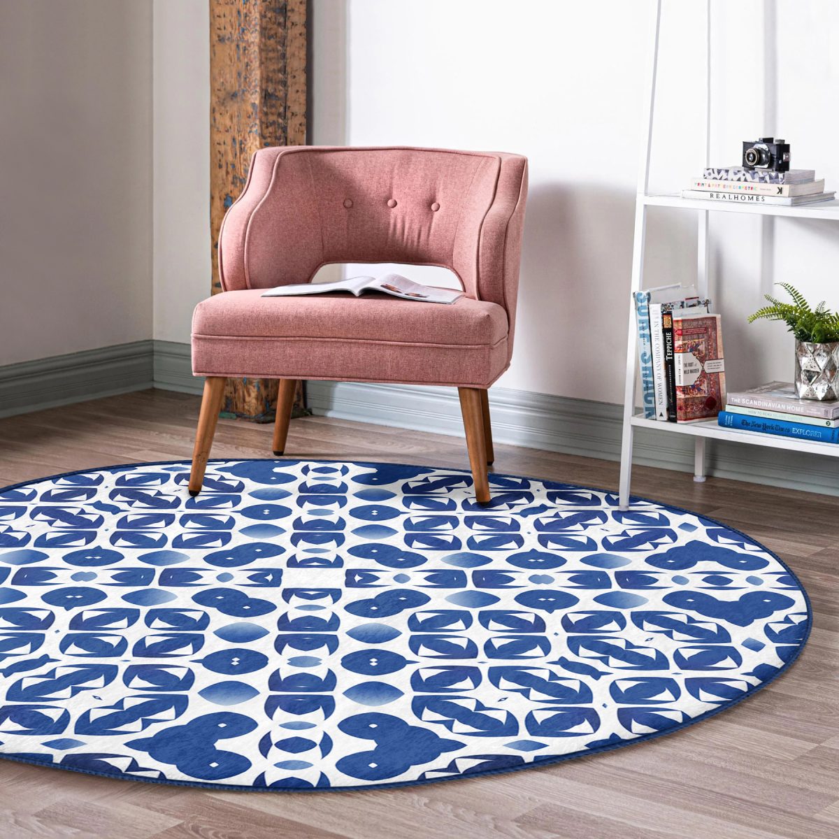 Beyaz Zeminde Çini Desenli Dijital Baskılı Modern Lacivert Mutfak Yıkanabilir Kaymaz Tabanlı Yuvarlak Halı
