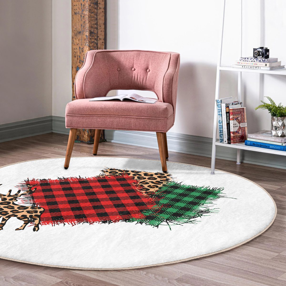 Beyaz Zeminde Ekoseli Kumaş Desenli Dijital Baskılı Modern Bordo Balkon Yıkanabilir Kaymaz Tabanlı Yuvarlak Halı