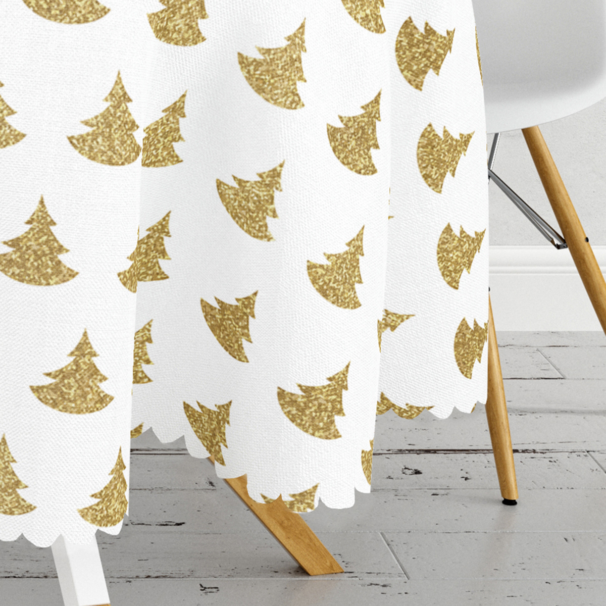 Beyaz Zeminde Gold Renkli Çam Ağacı Desenli Dijital Baskılı Modern Yuvarlak Masa Örtüsü – Çap 140cm